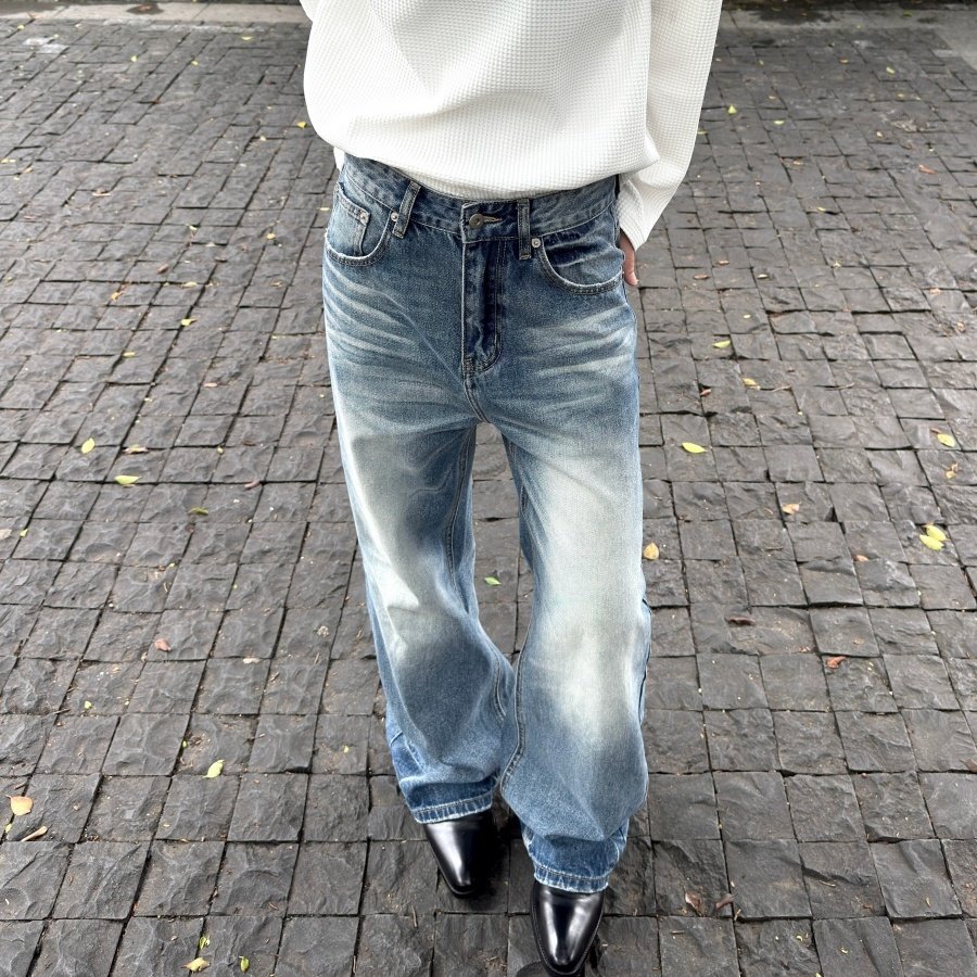 复古直筒牛仔裤男款春季宽松美式百搭裤子潮牌水洗做旧阔腿长裤子
