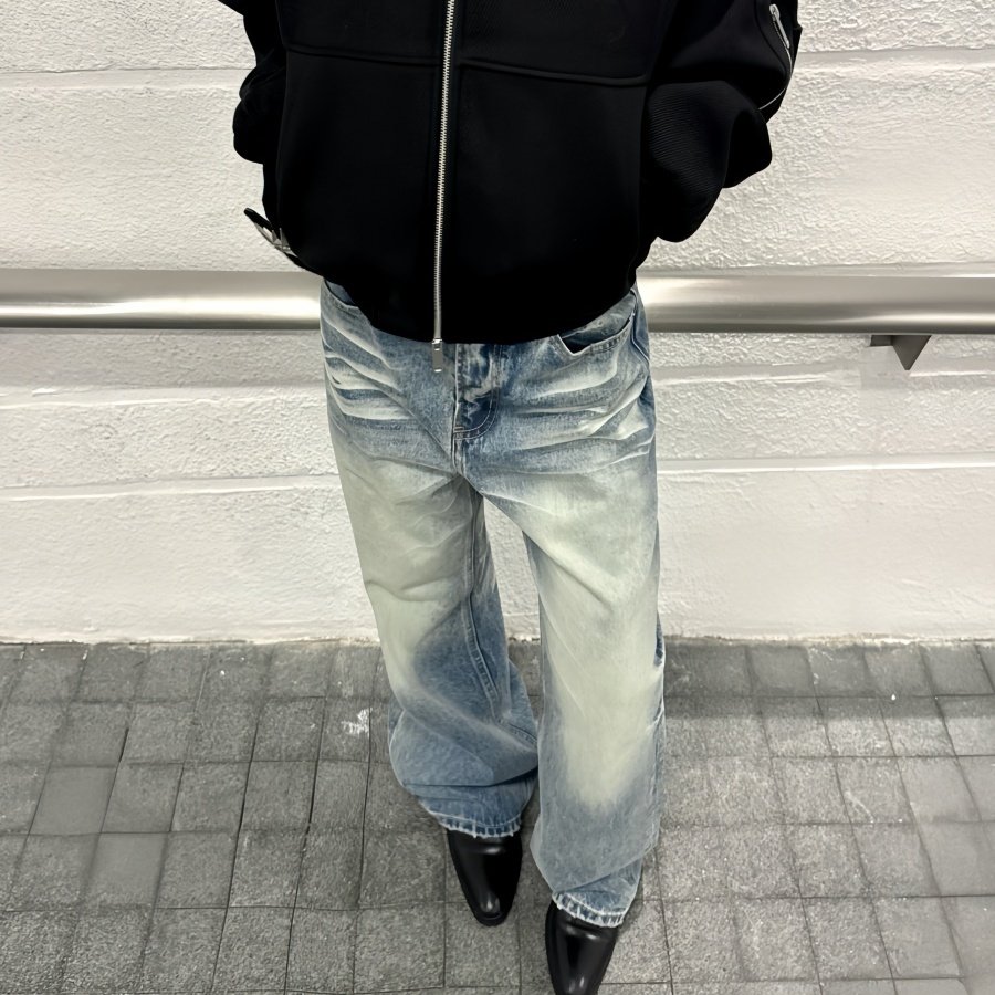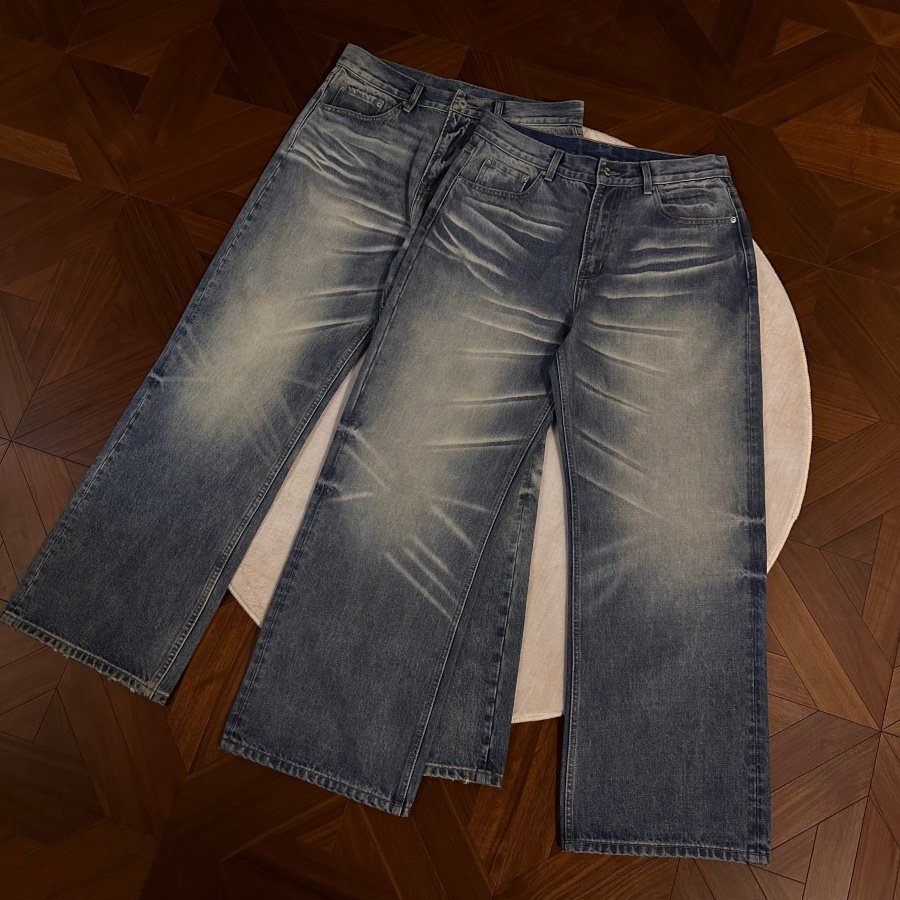 LR MADE 24AW 侧缝立体弯刀 前后喷马骝 水洗做旧廓形牛仔长裤