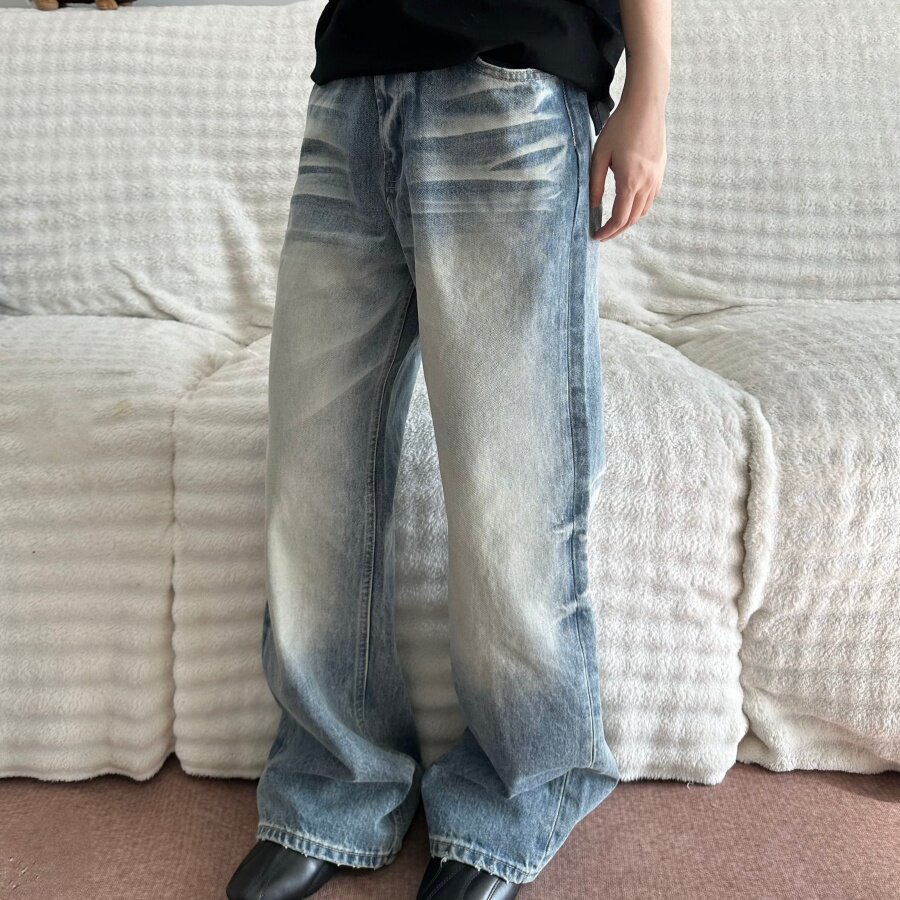 UNKNOWTAL 水洗做旧黄泥蓝浅色直筒牛仔裤弹性宽松休闲百搭长裤