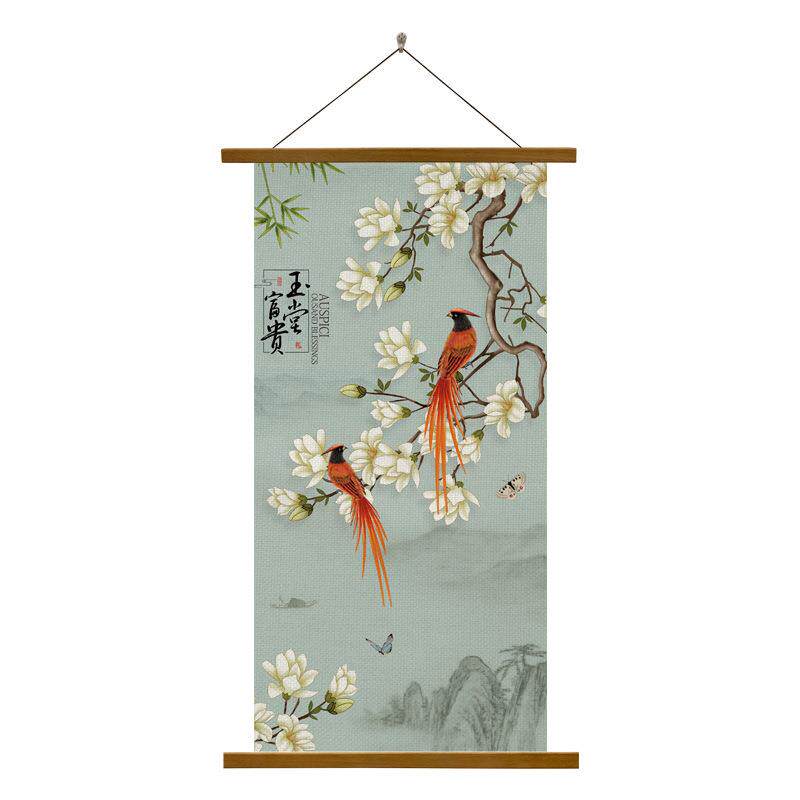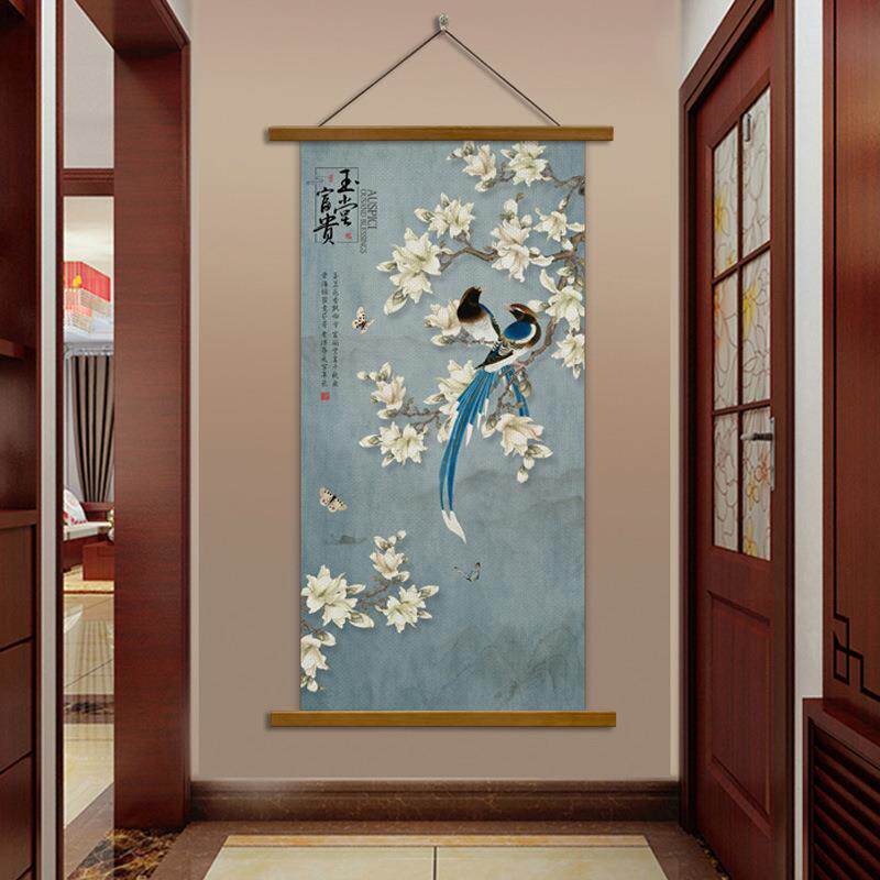 5ZW新中式挂画花鸟喜鹊布艺无框画客厅玄关走廊装饰画竖版风壁画