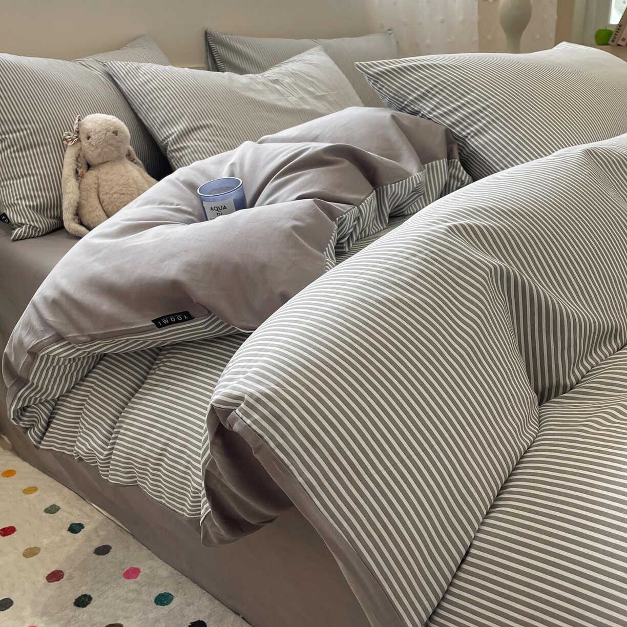 简约条纹四件套纯棉床品套件灰色被套床单枕套全套全棉四季通用