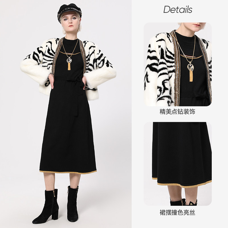 kodice女装秋季新款黑色点钻圆领镂空长袖连衣裙A字裙针织裙子