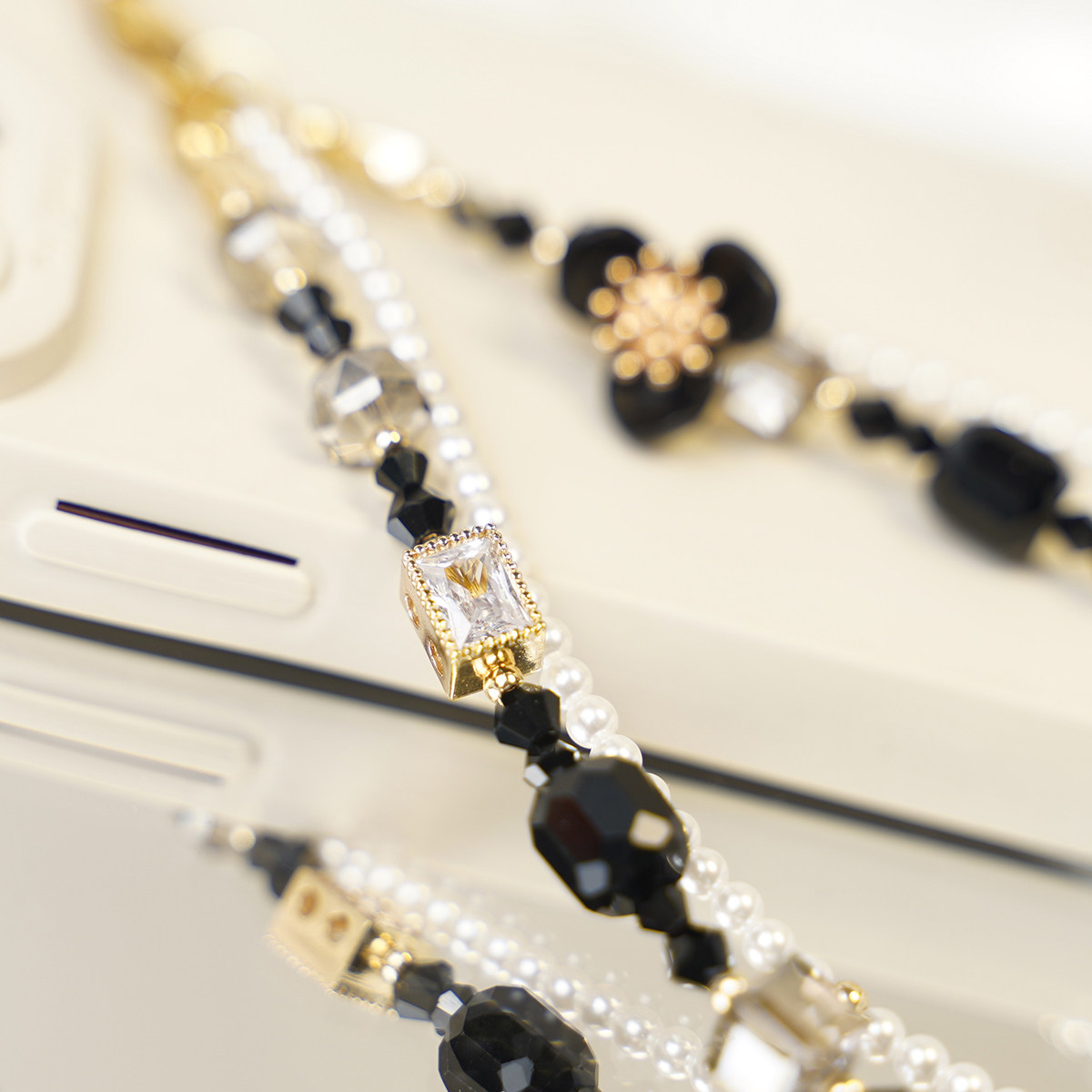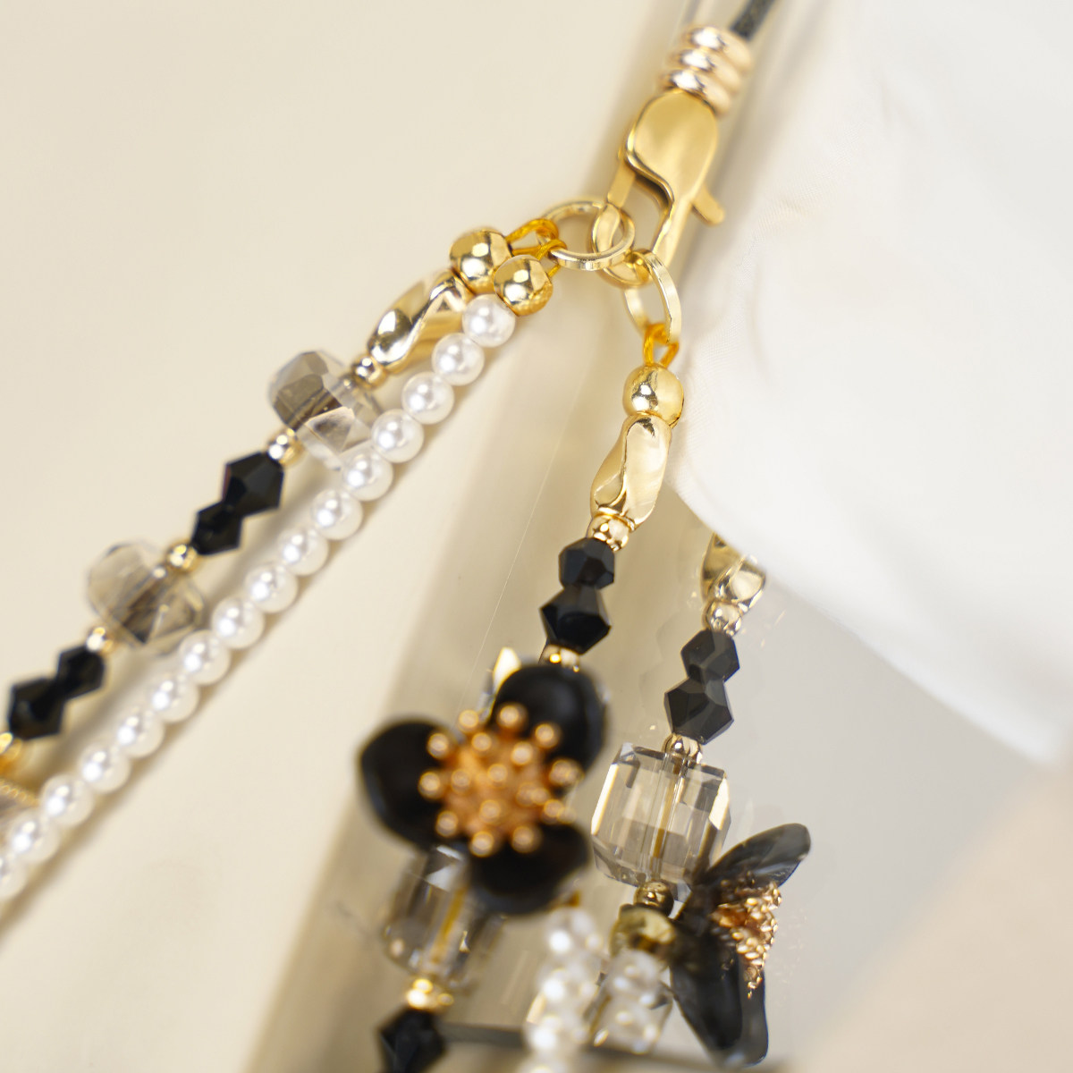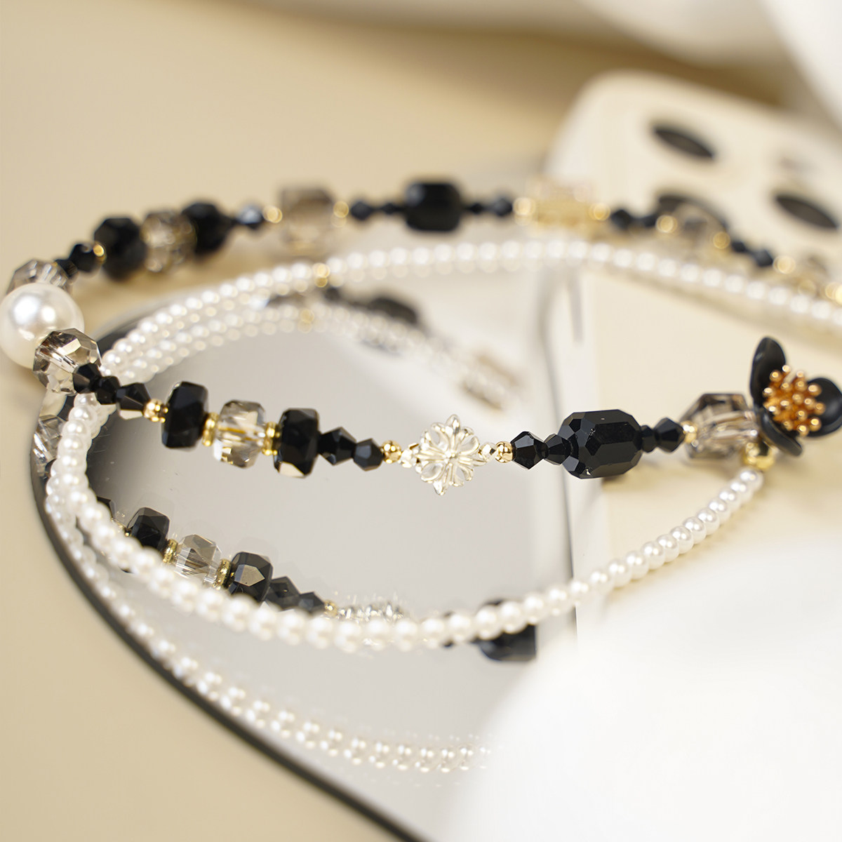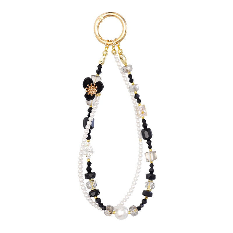 精致小香风黑白合金水晶锆石珍珠手机挂链挂件