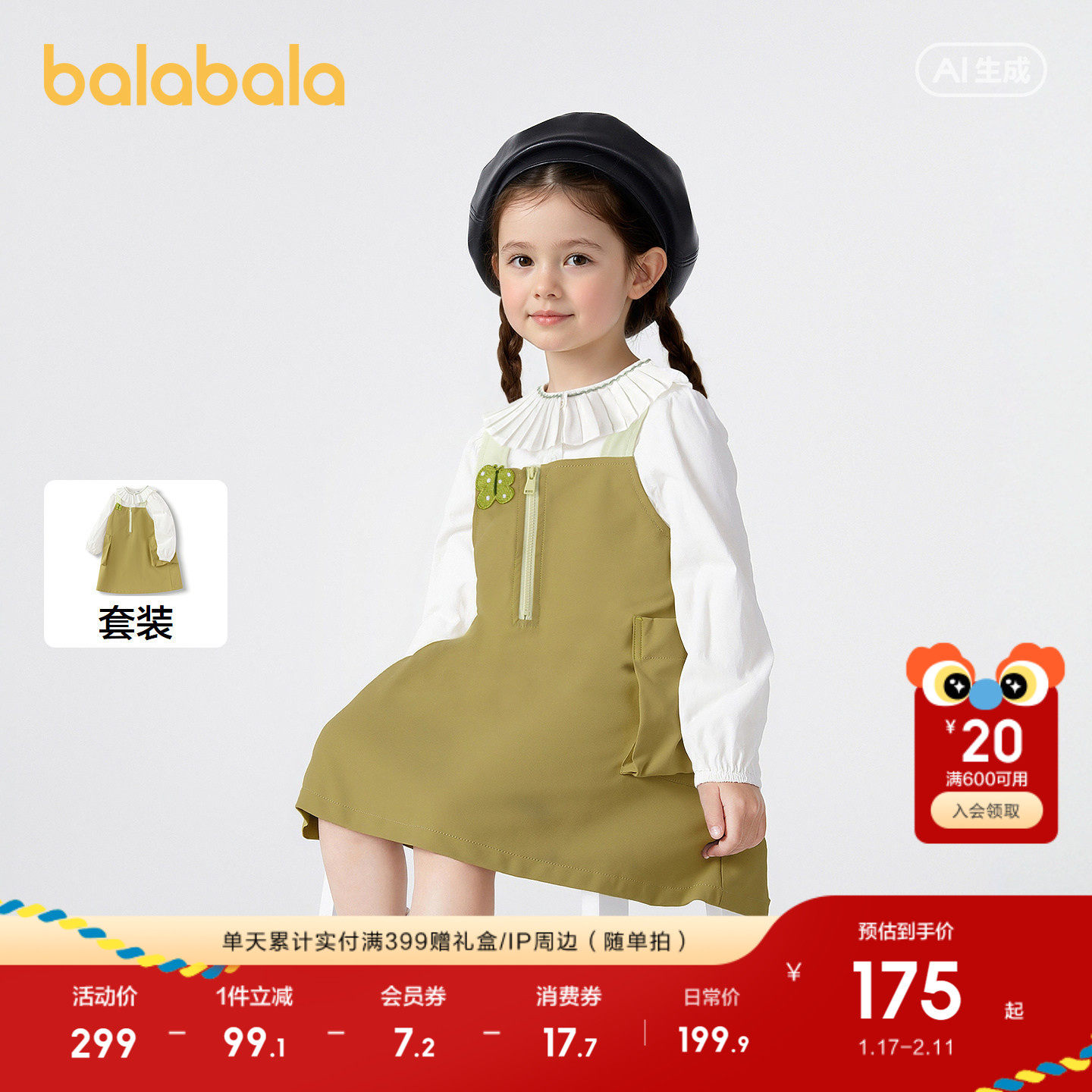 巴拉巴拉童装儿童连衣裙女童春秋装背带裙两件套口袋绣花甜美洋气