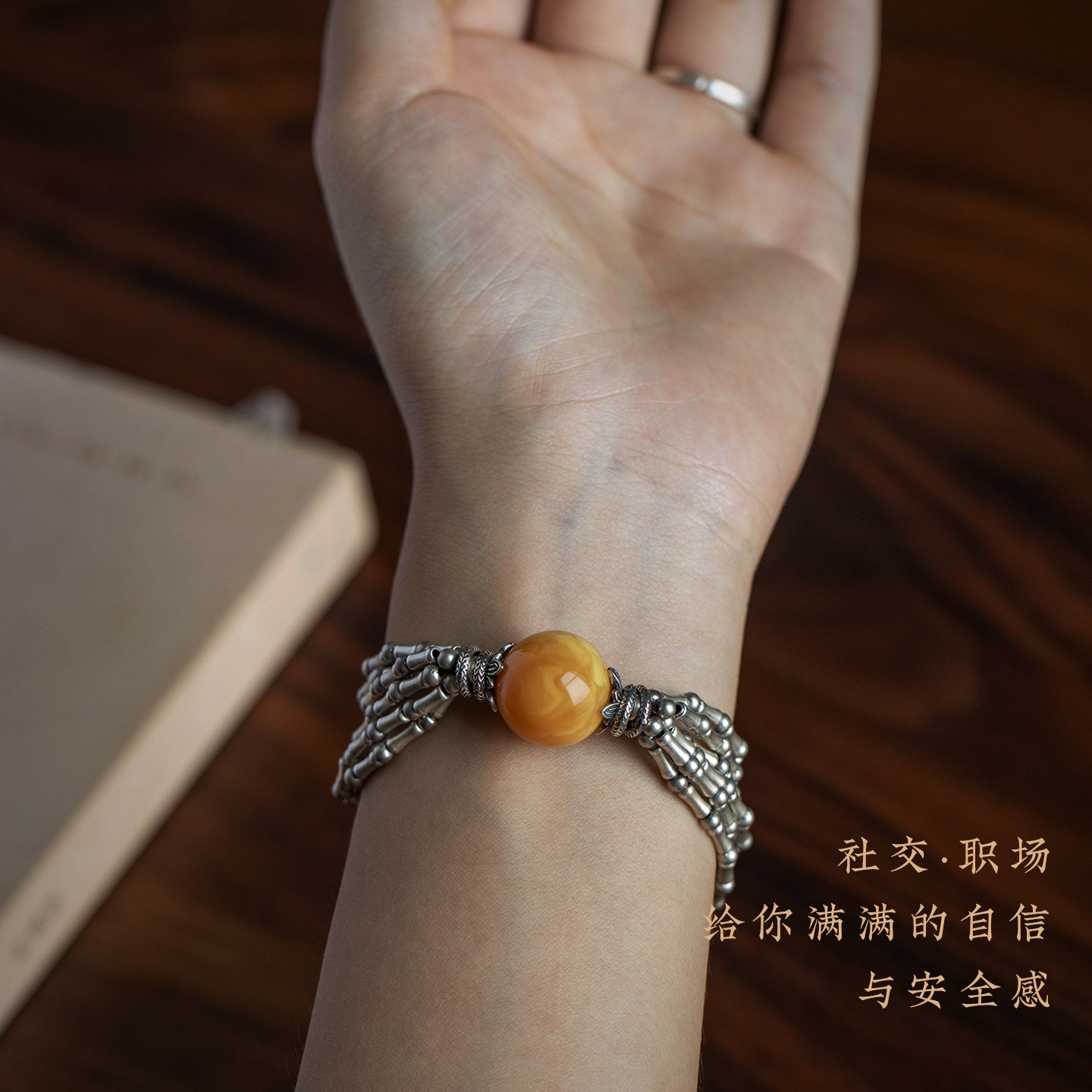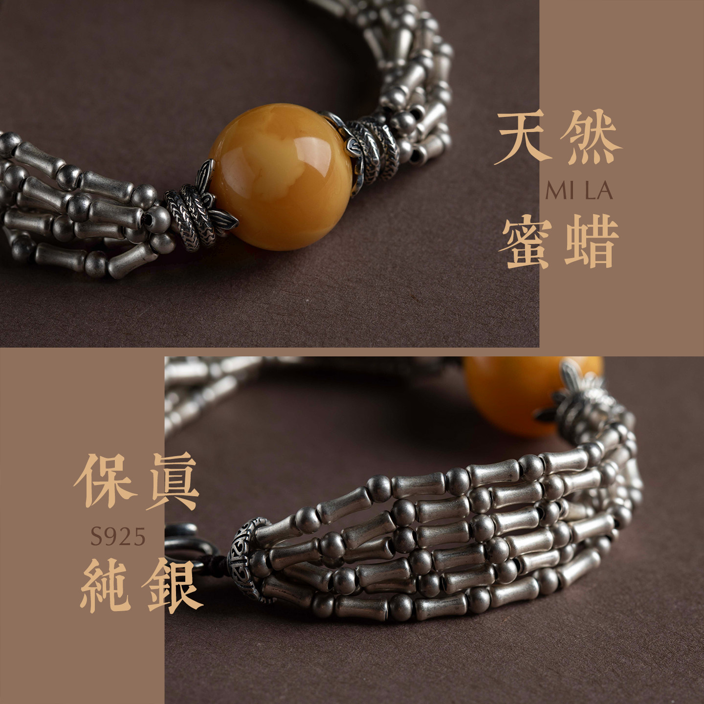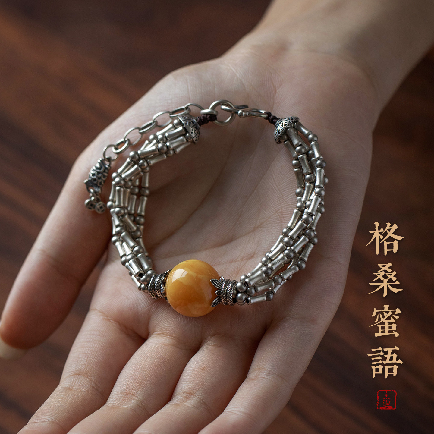 【设计师款】藏式纯银竹节手链天然琥珀蜜蜡手串新中式重工复古