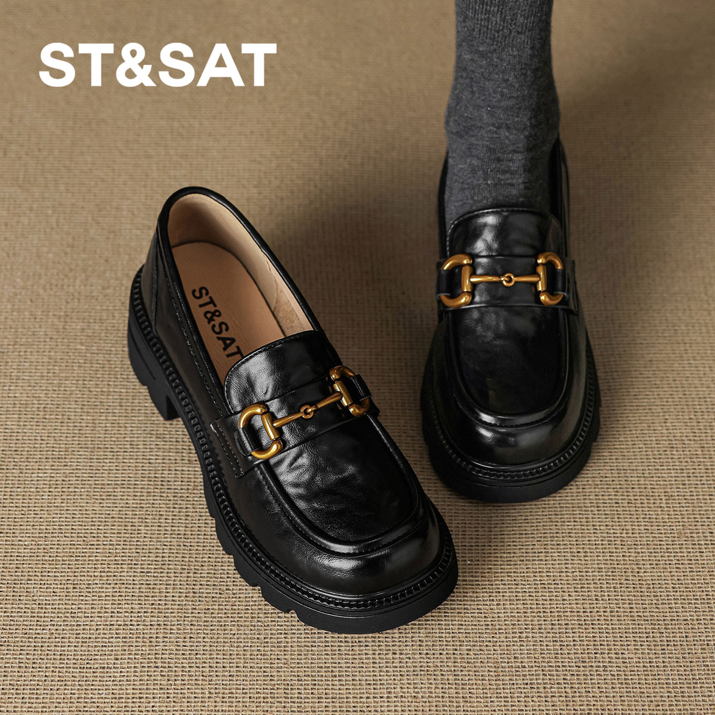 星期六厚底乐福鞋女不累脚一脚蹬黑色小皮鞋