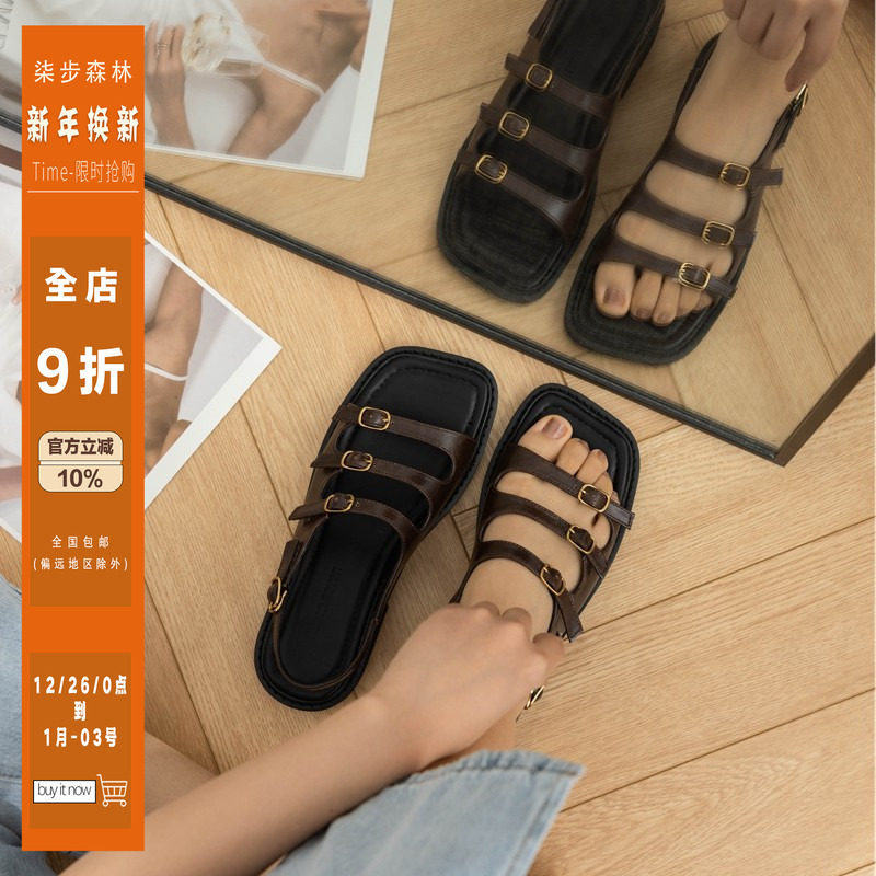 柒步森林真皮复古法式时装粗跟平底罗马露趾凉鞋子女新款2025夏季