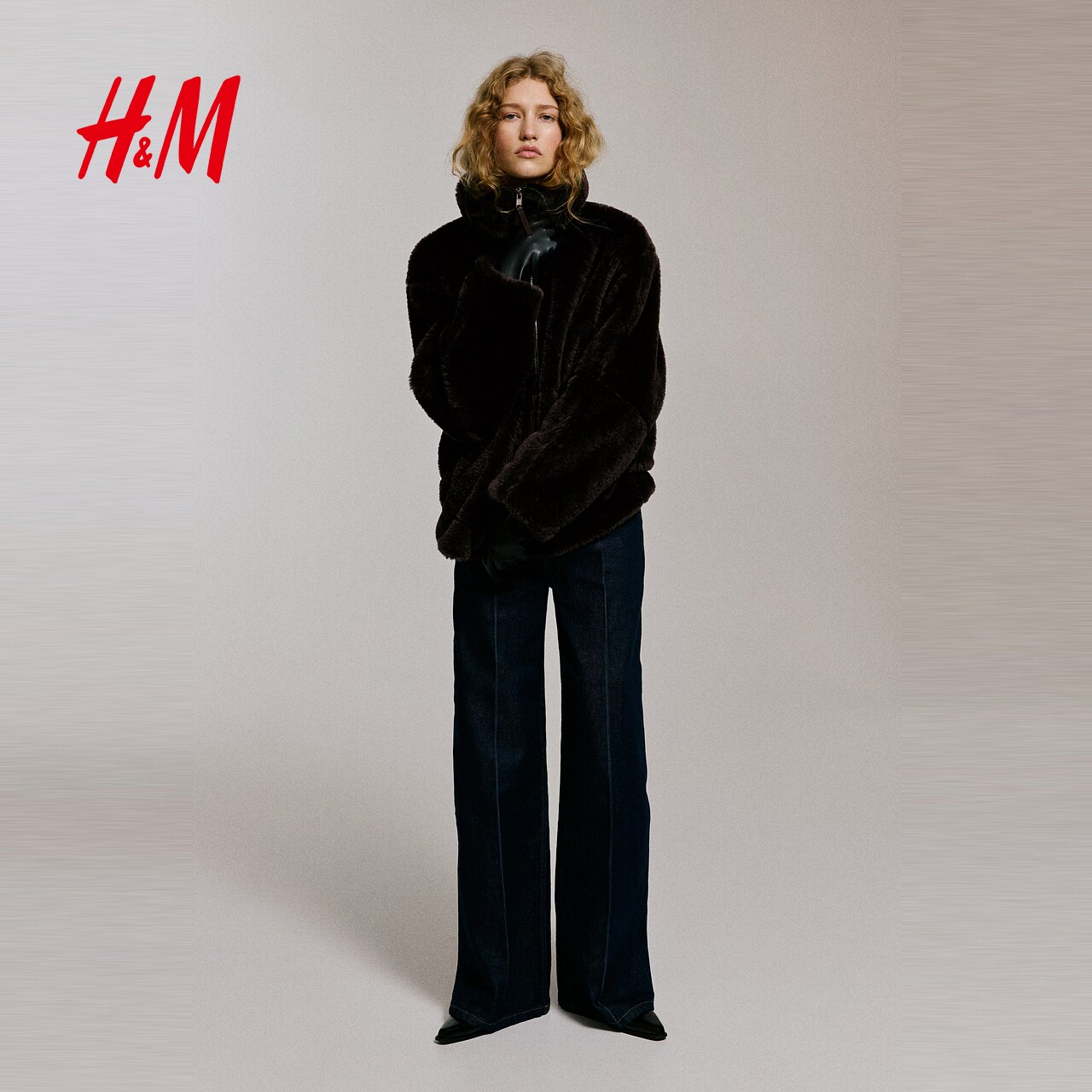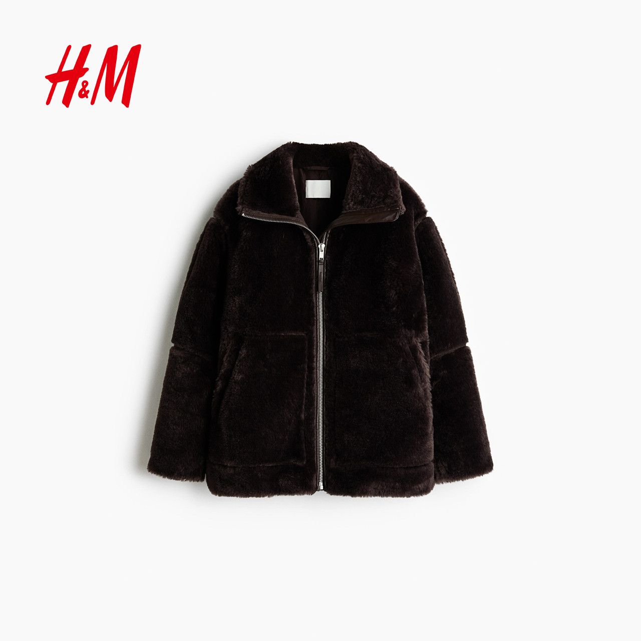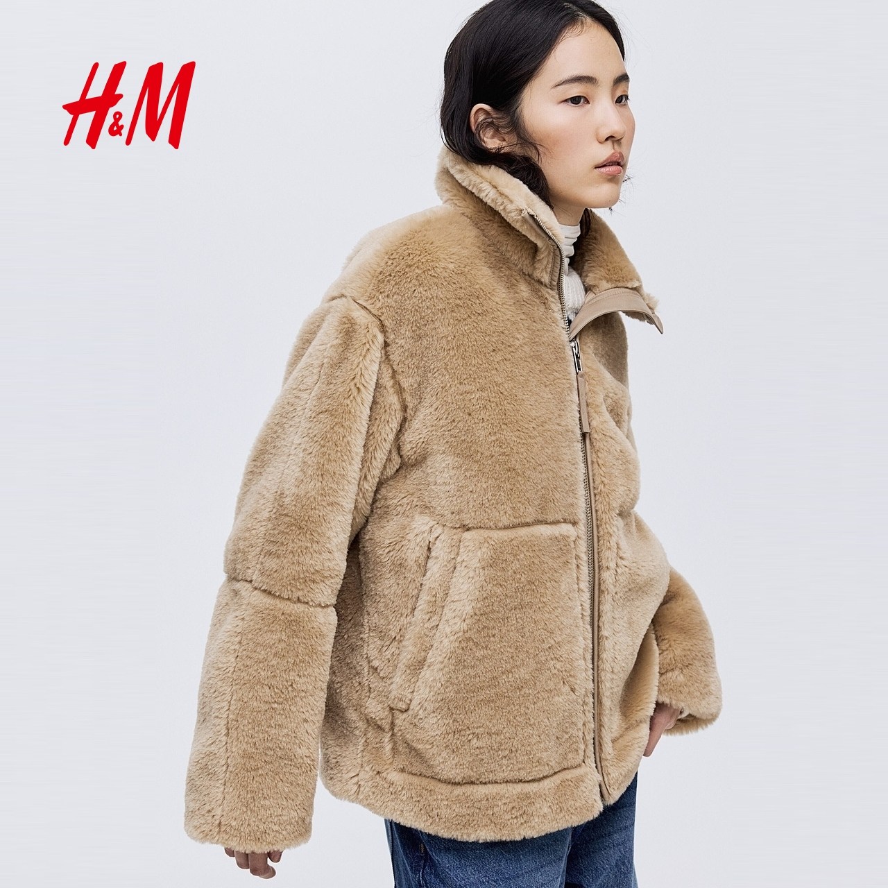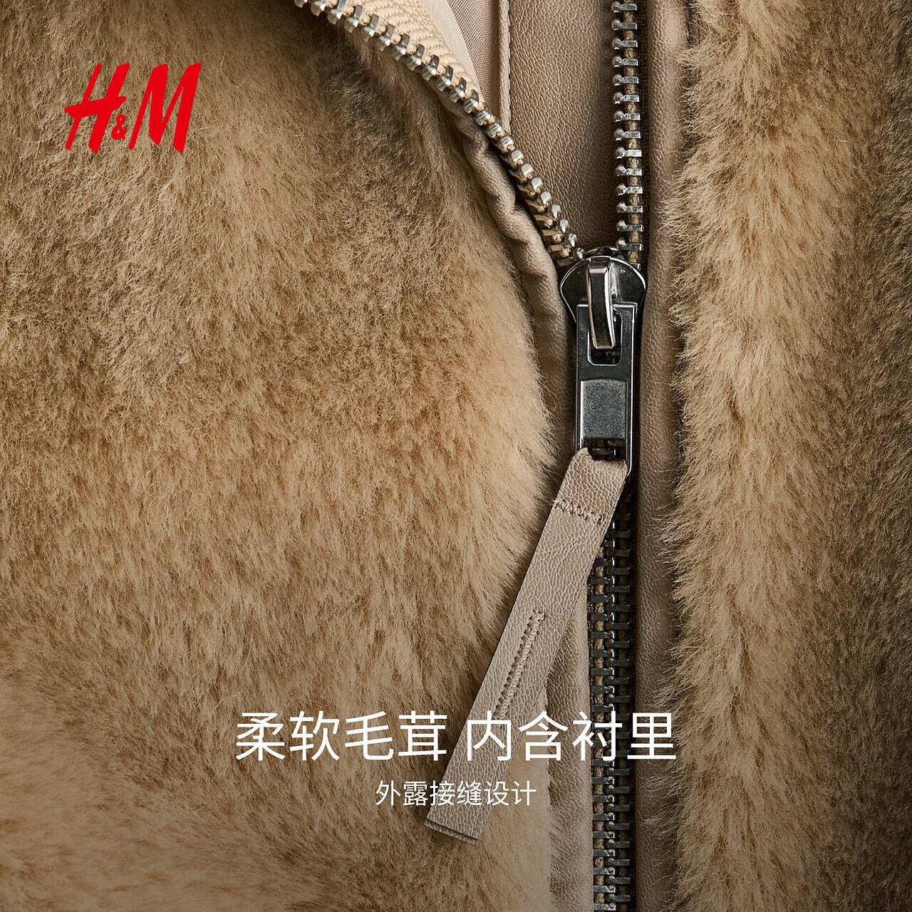 HM女装皮草冬季翻领拉链毛茸大廓形冬装保暖外套1305129