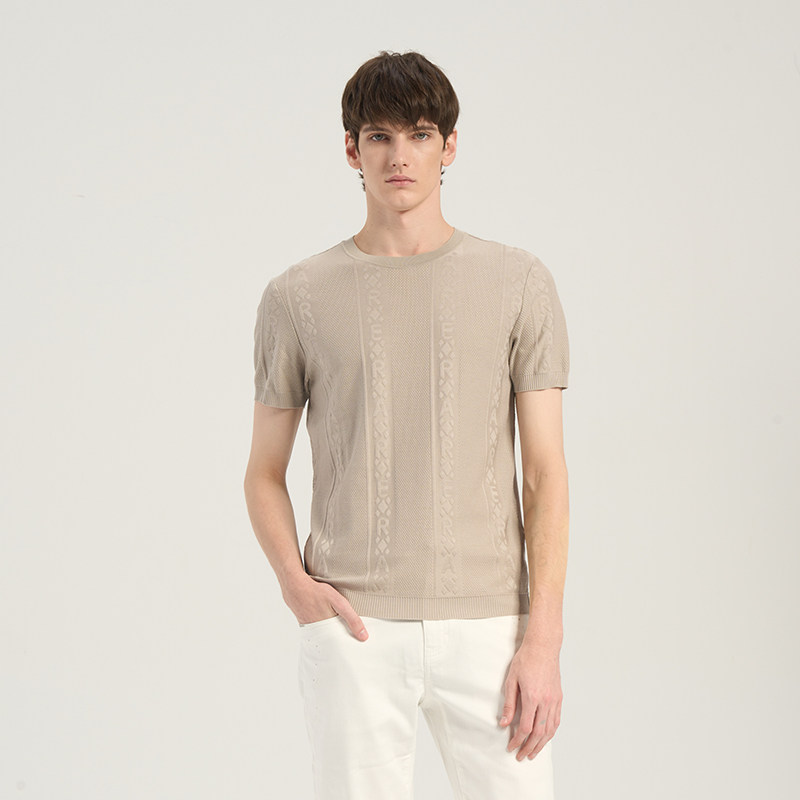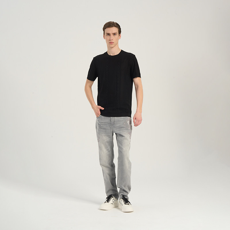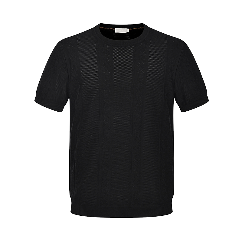 RARE威雅男装 夏季新款男士黑色短袖竖条挑孔提花圆领短袖T恤