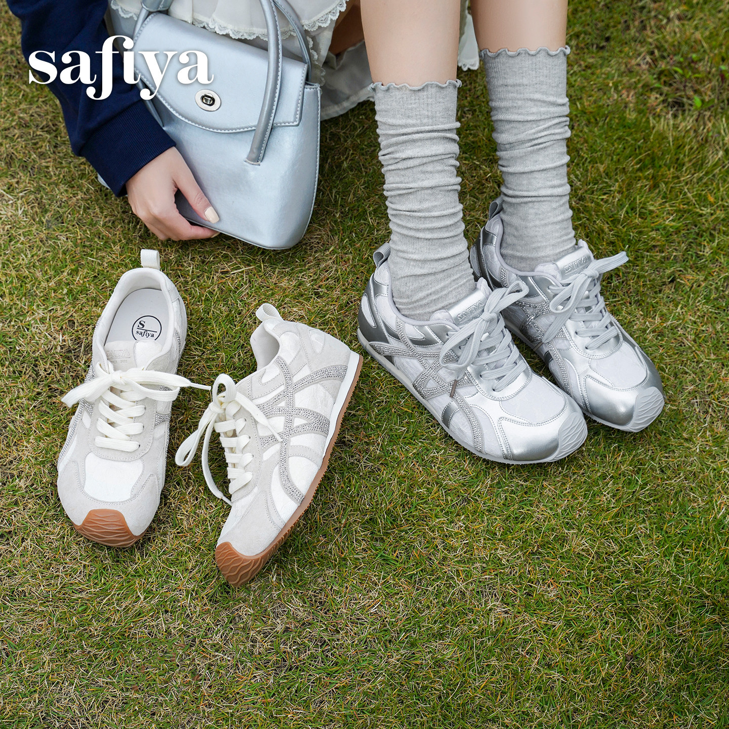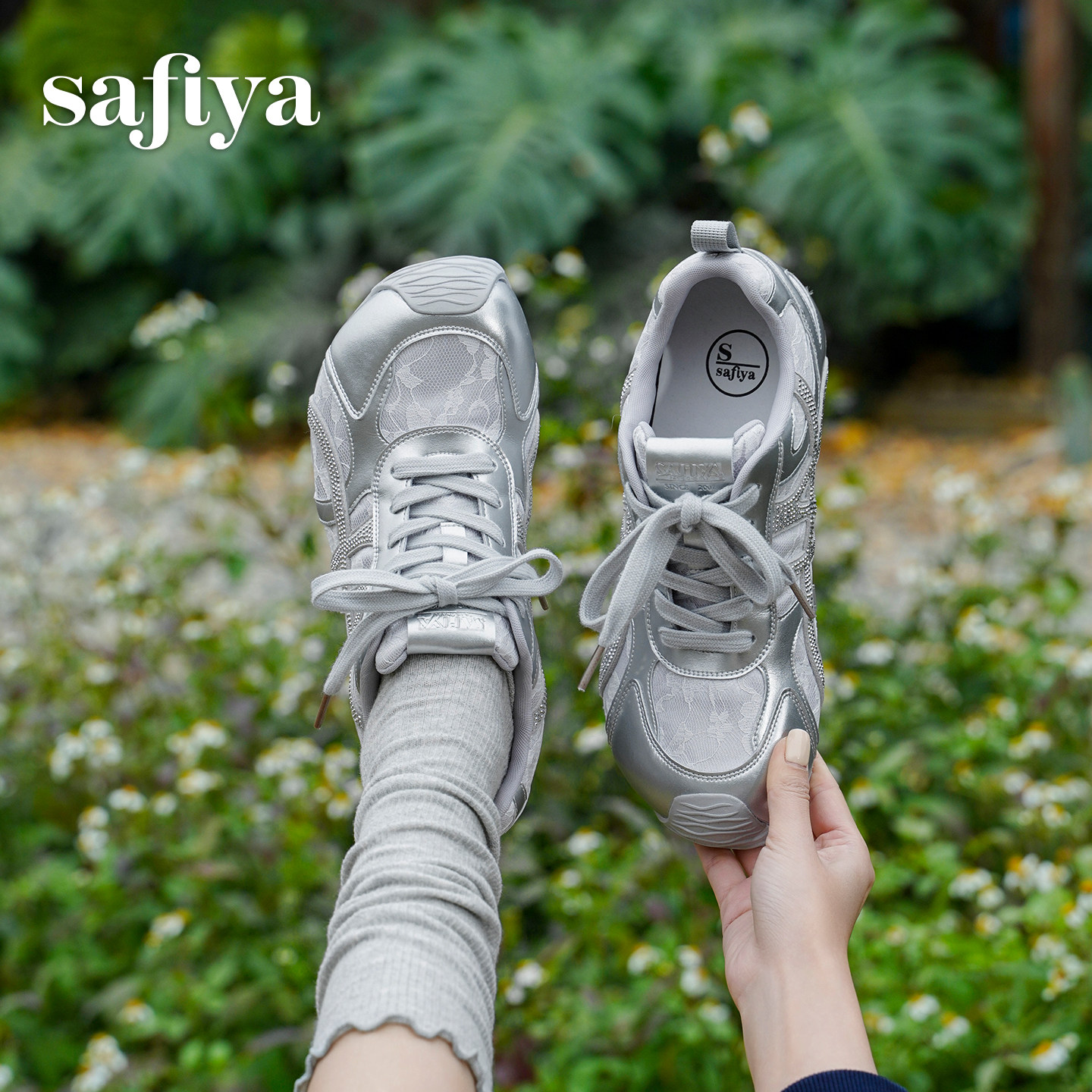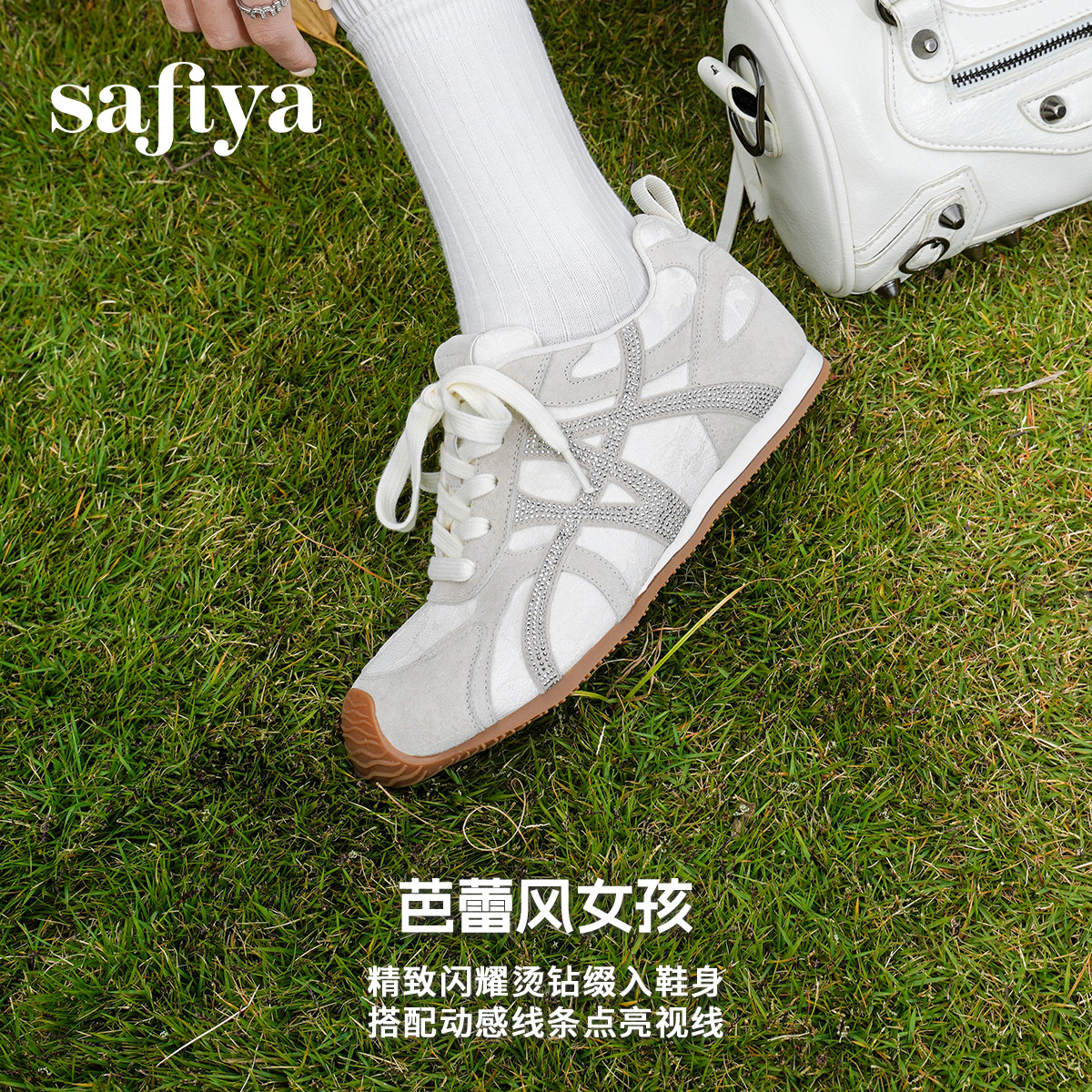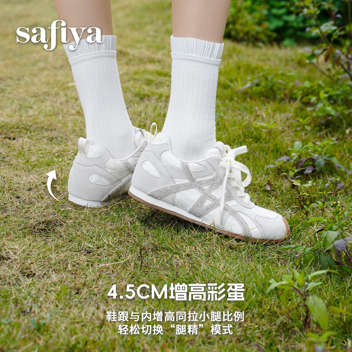 索菲娅2026年春季新品烫钻时尚圆头百搭内增高透气蕾丝芭蕾阿甘鞋