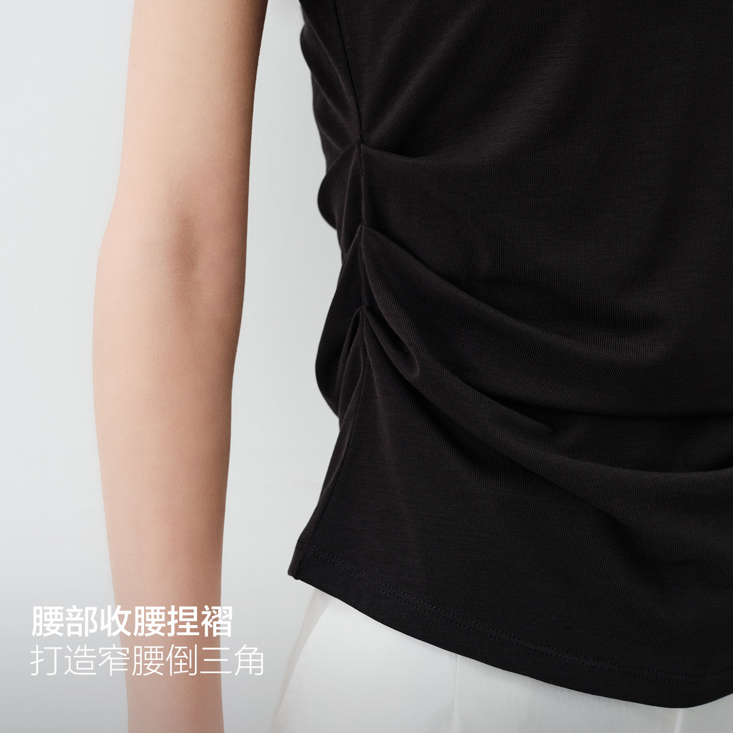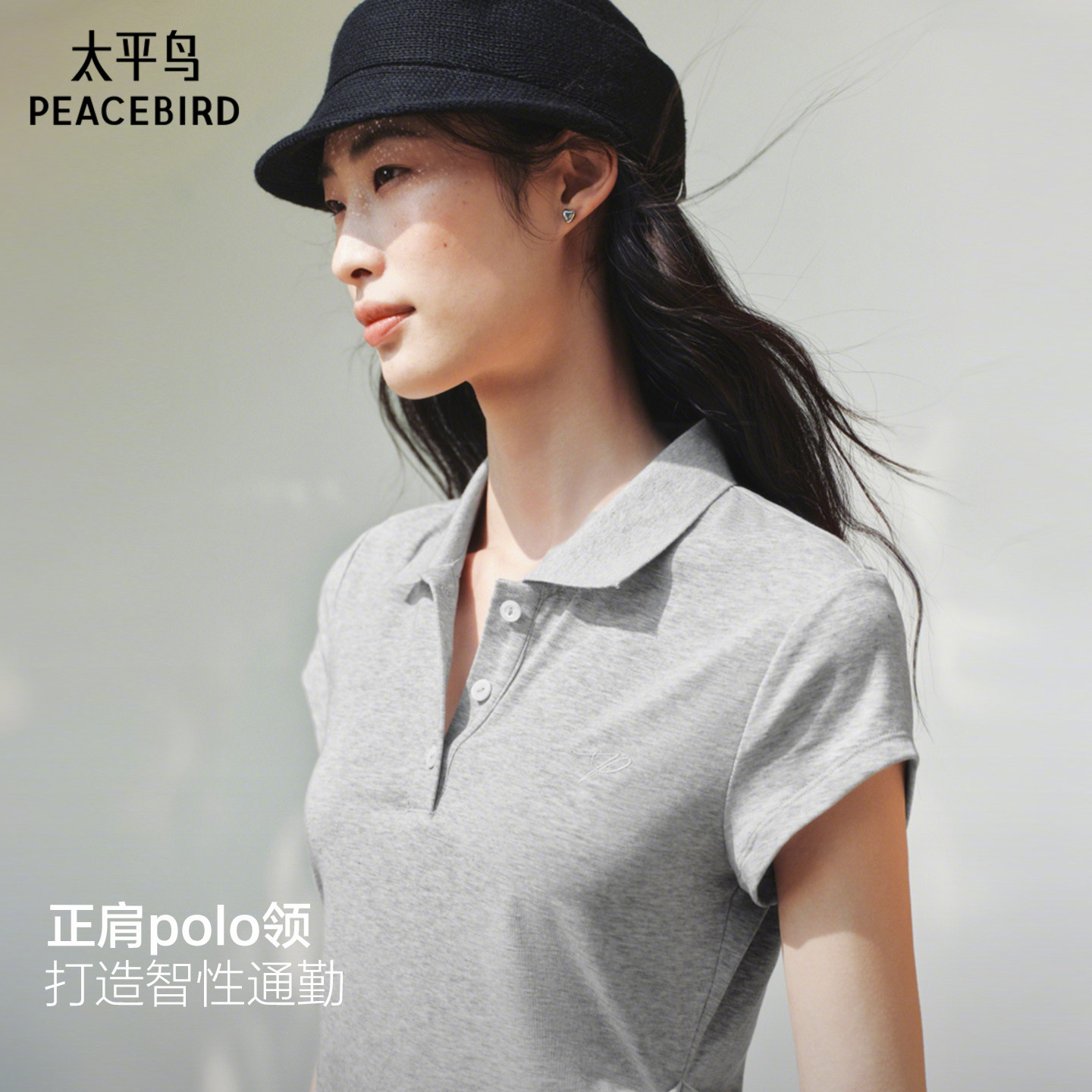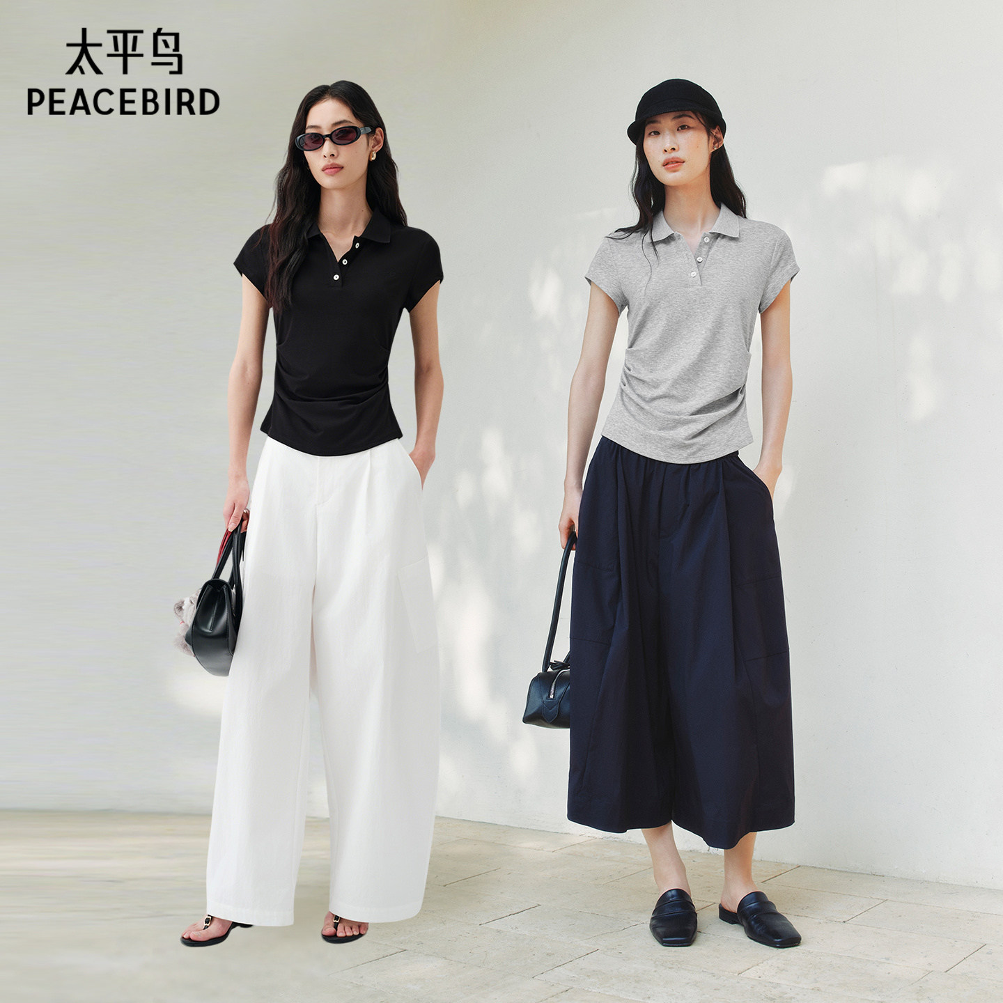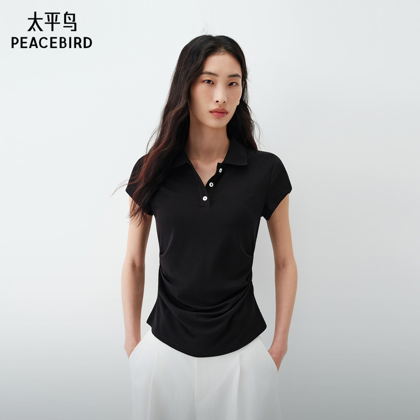 太平鸟莱赛尔混纺高智通勤polo领短袖T恤26春季新款腰部捏褶上衣