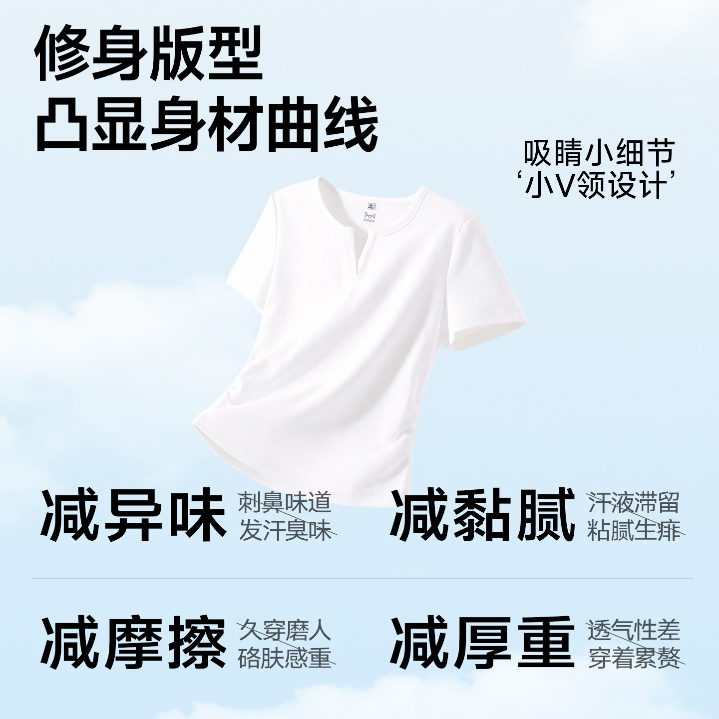 猫人正肩V领纯棉短袖t恤女设计感小众收腰修身显瘦上衣体恤夏季Z
