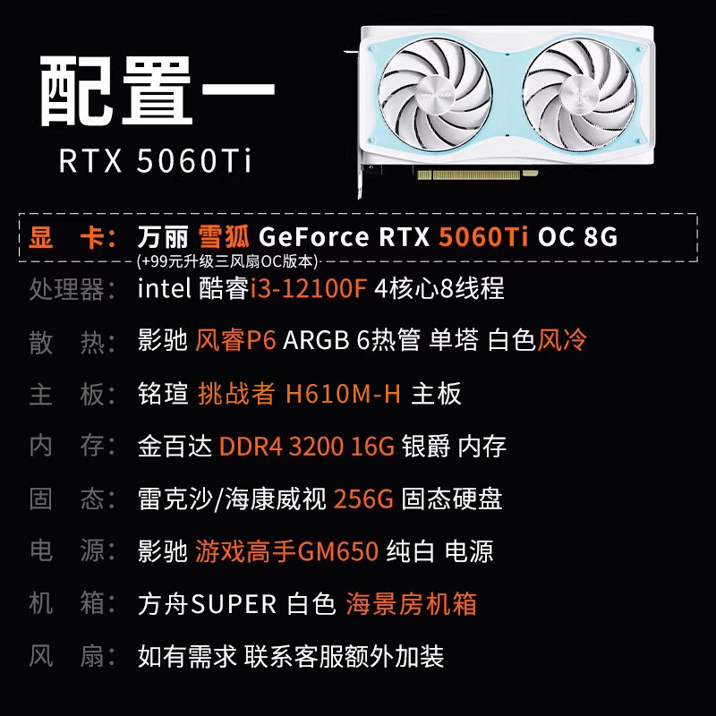 万丽 RTX 5060Ti 8GB+12400F/14400F/14600K 雪狐显卡台式电脑主机DIY组装办公游戏电竞AI渲染直播白色海景房