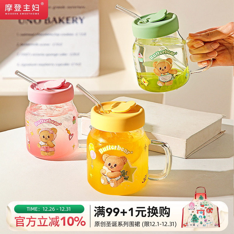 【摩登主妇&黄油小熊】带盖玻璃水杯高颜值吸管杯子办公室果汁杯