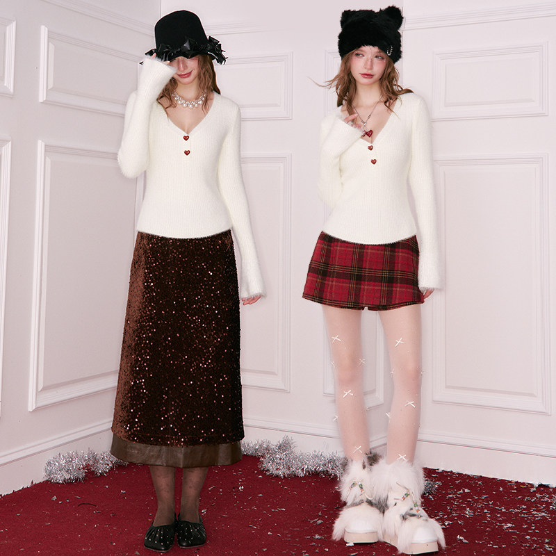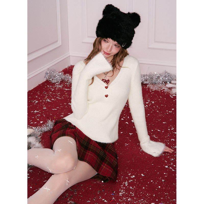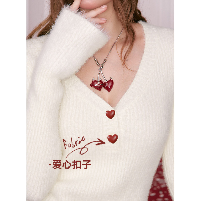 妖精的口袋纯欲风v领毛绒白色毛衣女2025年冬季新款修身新年穿搭