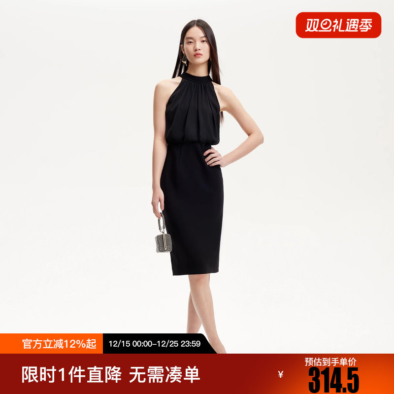 绫致Vero Moda连衣裙25冬新挂脖系带褶皱雪纺拼接宴会优雅礼服裙