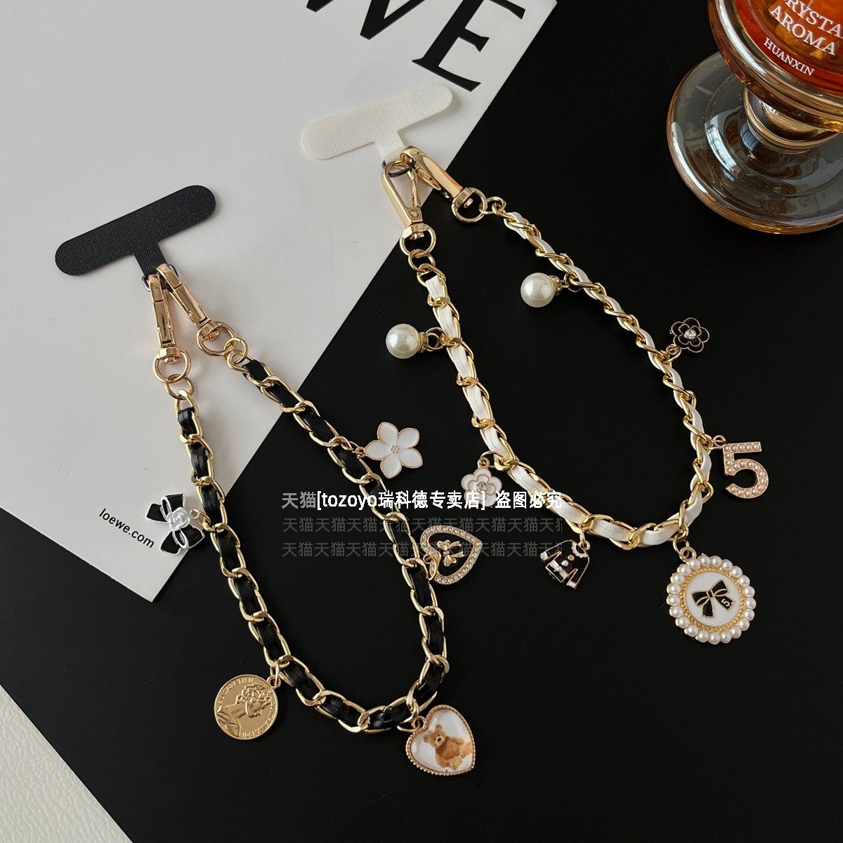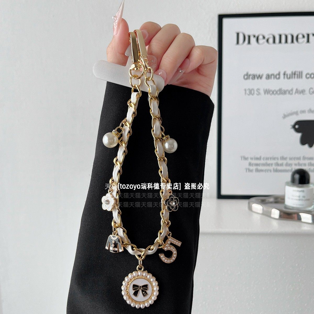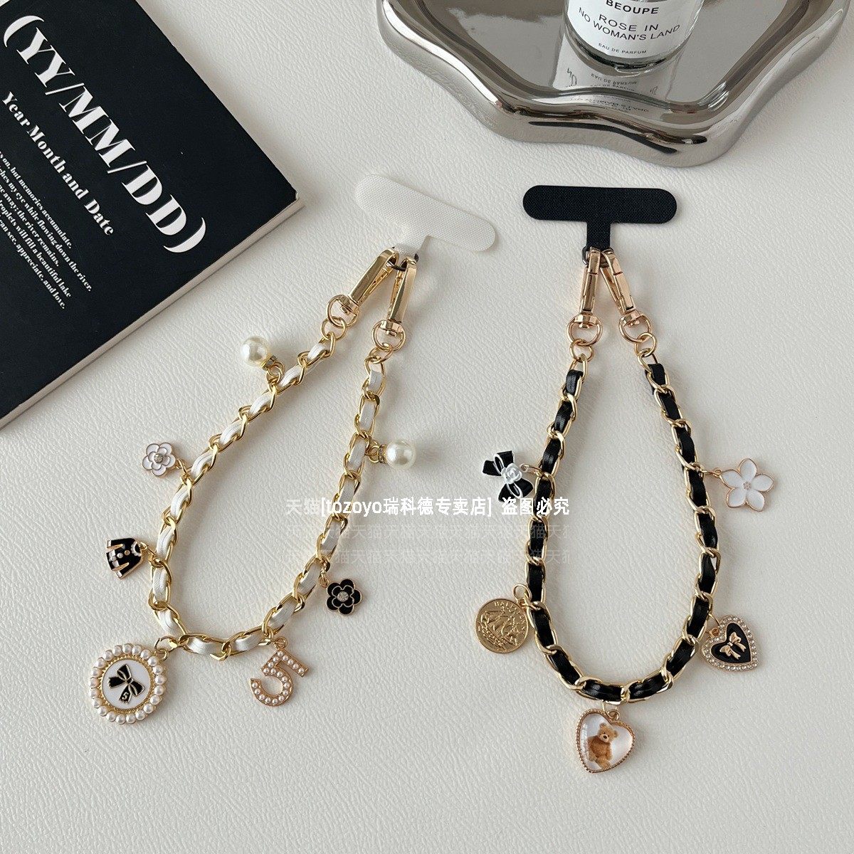 ins小香风手机链黑白皮革金属挂链挂手腕山茶花爱心珍珠吊坠时尚大牌手提包包链条女手链防丢挂绳吊绳挂饰壳