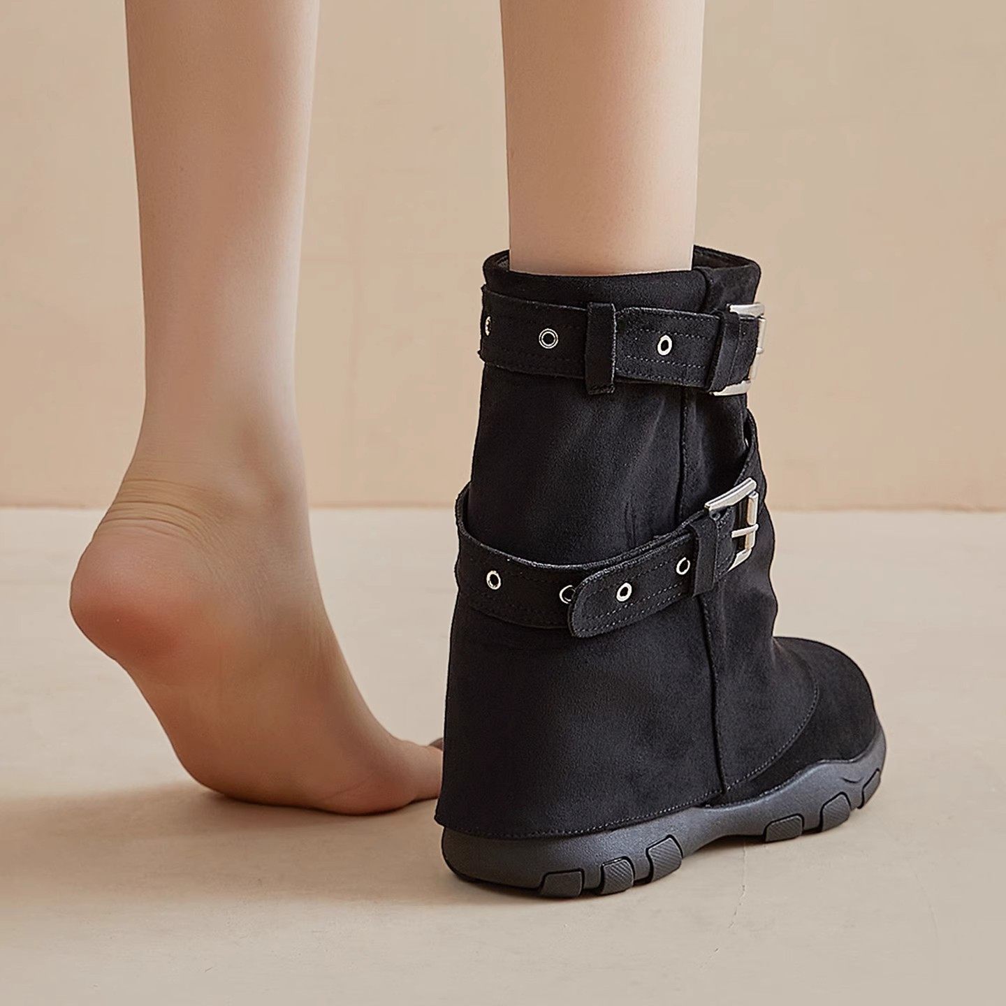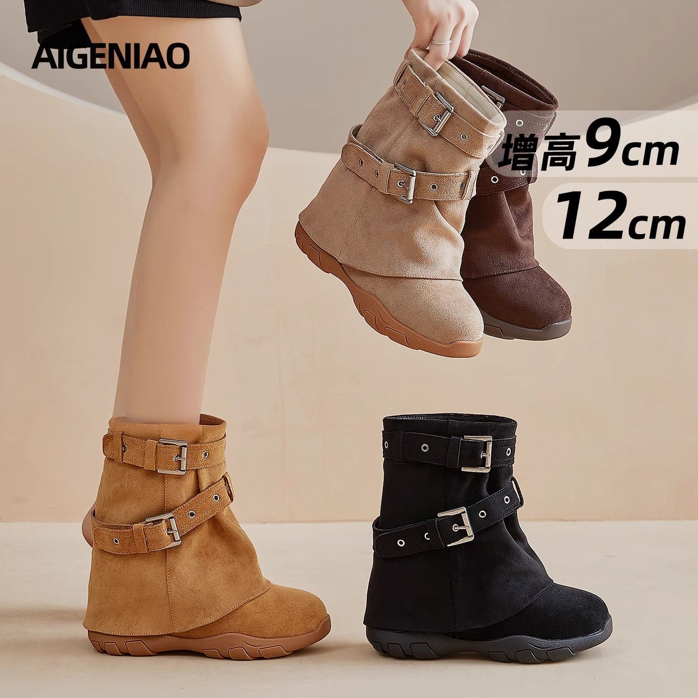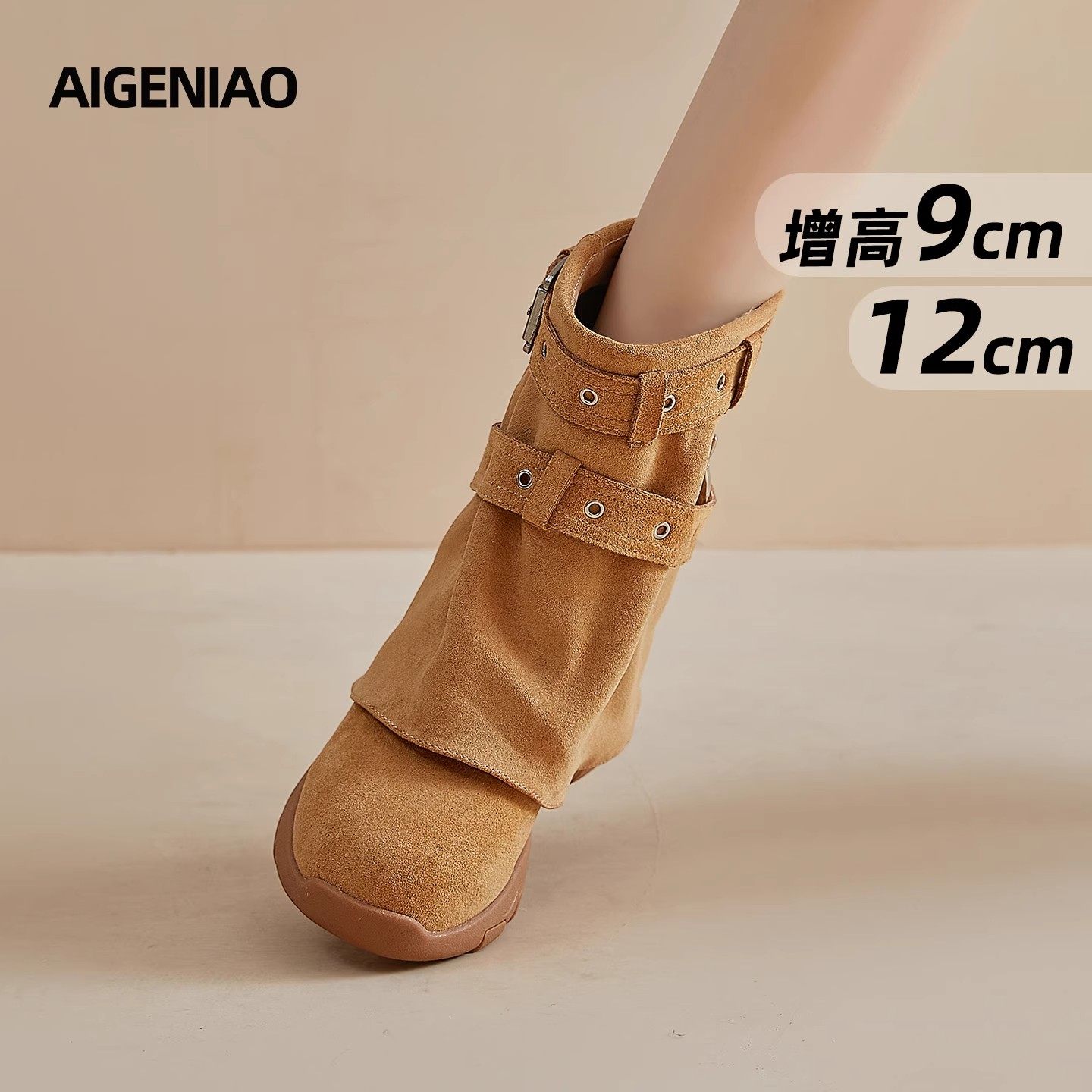 牛皮版~内增高复古短靴女2025秋冬西部马丁靴圆头短筒勃肯堆堆靴