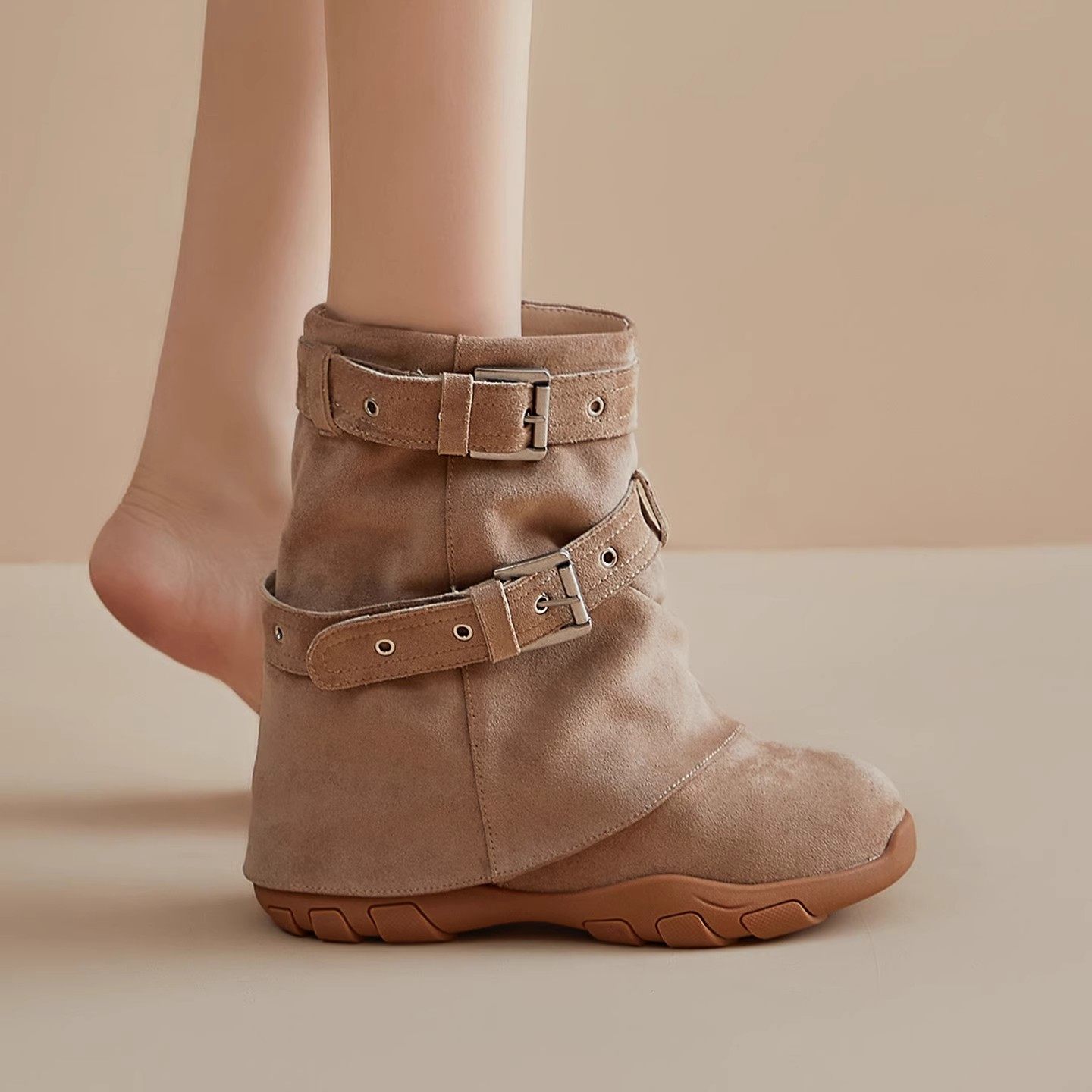 羊皮版~内增高靴子女2025新款爆款中筒粗跟短靴卡其色褶皱堆堆靴