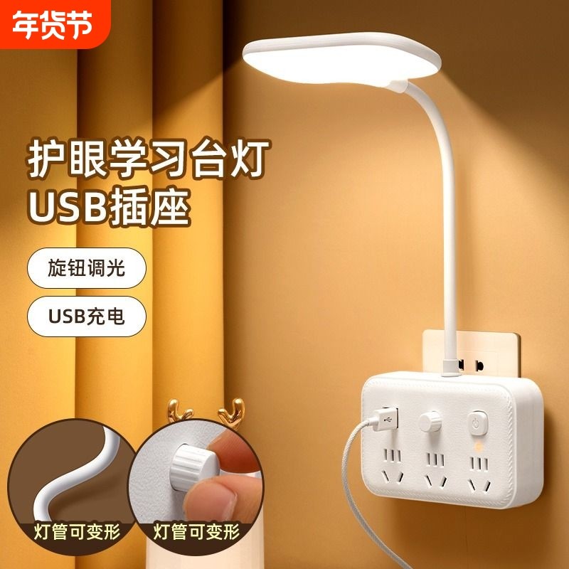 多功能护眼台灯带开关插座壁灯可调光温馨卧室床头起夜柔光伴睡灯