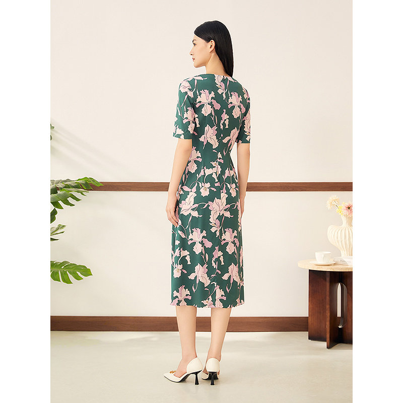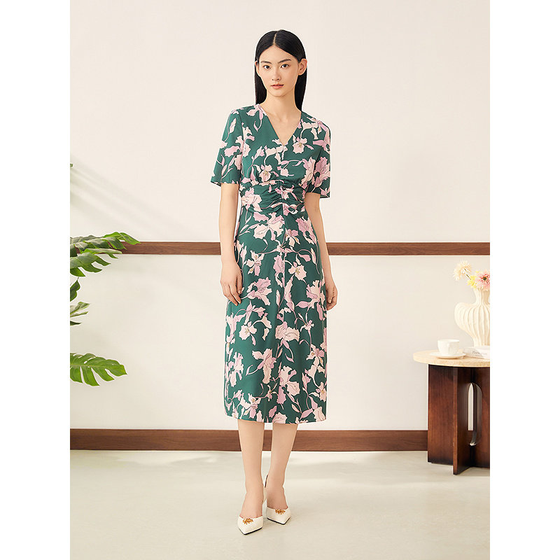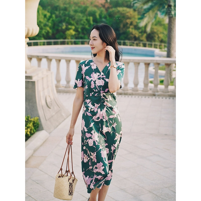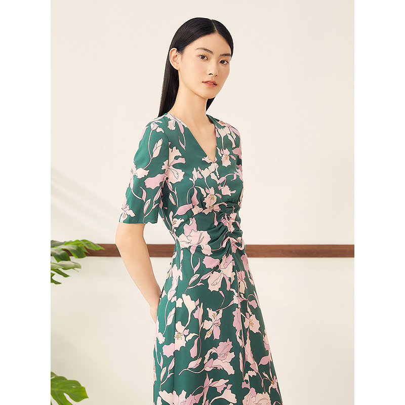 YINER音儿2025秋季新款法式艺术印花V领收腰桑蚕丝真丝连衣裙