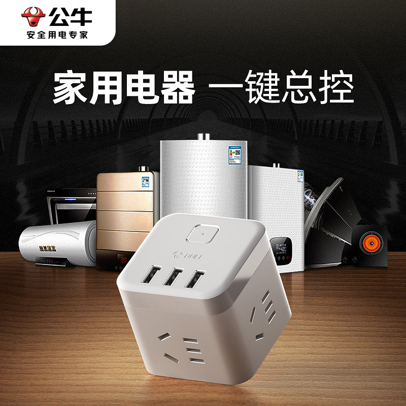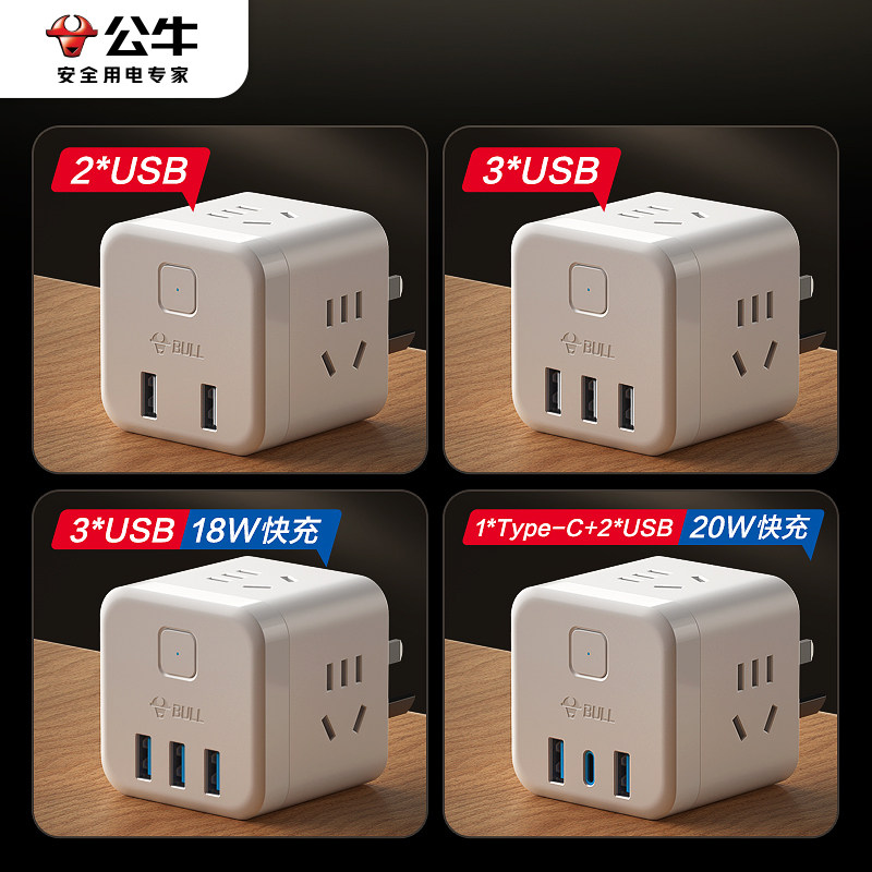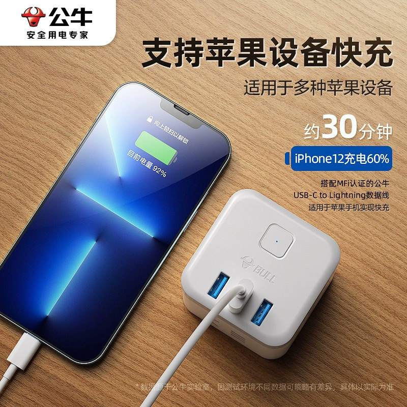 公牛魔方充电器USB插头多口宿舍用床头拓展多用桌面充电头适用iPhone14/15安卓手机通用20W/30W快充
