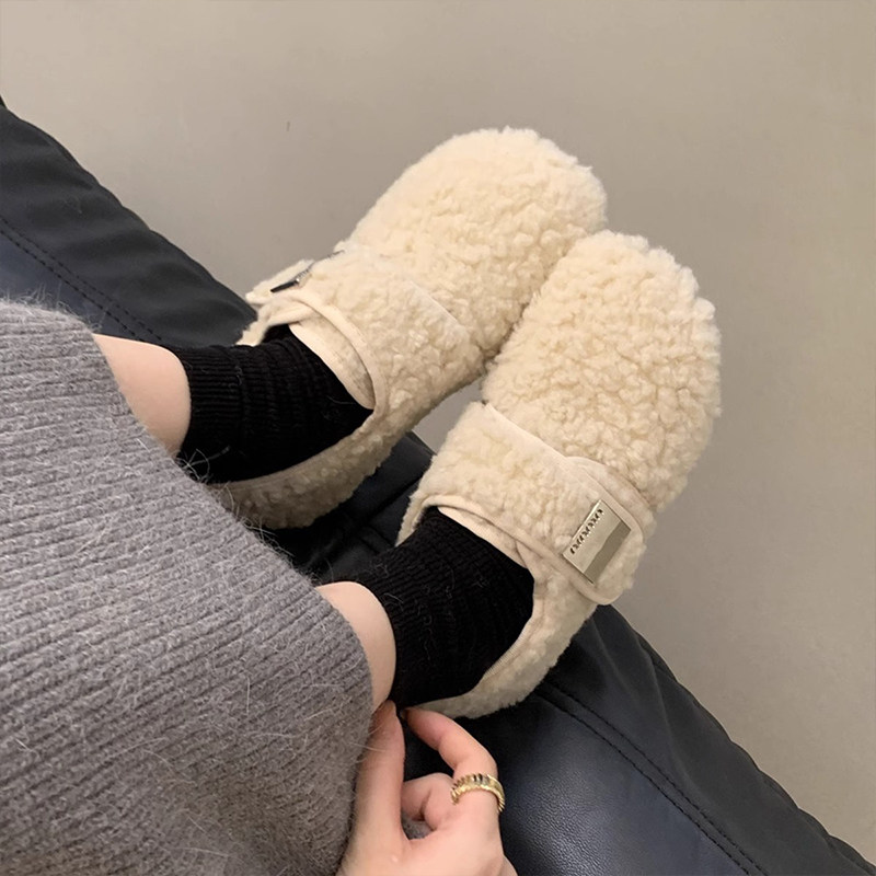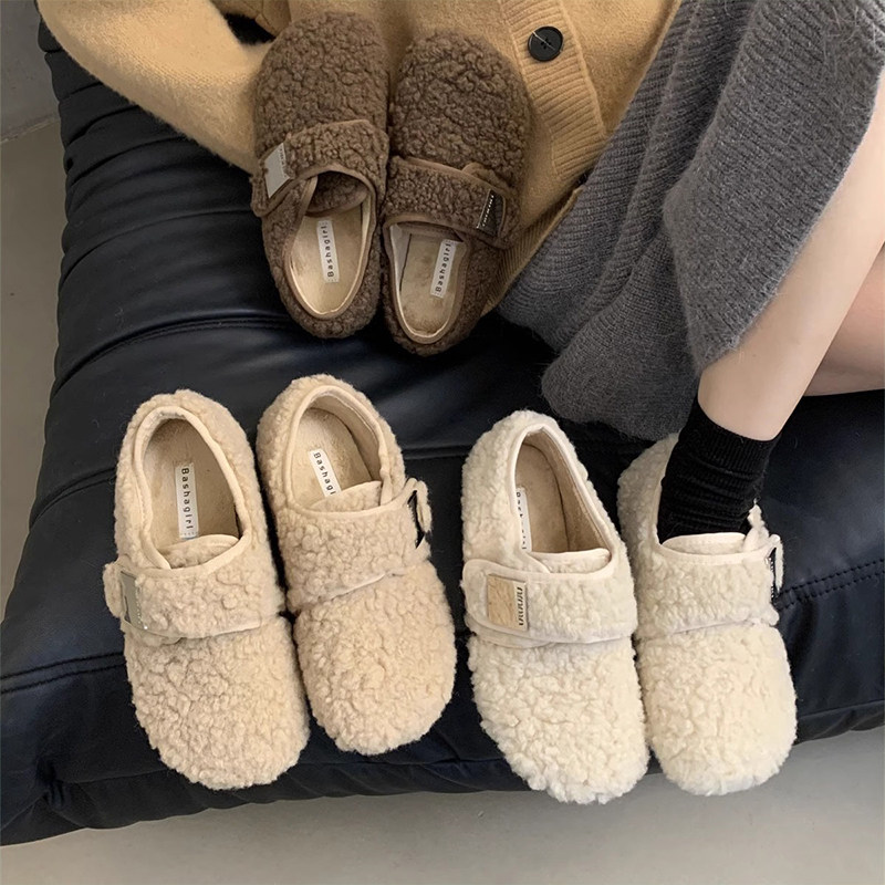 平底魔术贴一脚蹬超火羊羔毛毛鞋子女冬外穿2025新款加绒豆豆棉鞋