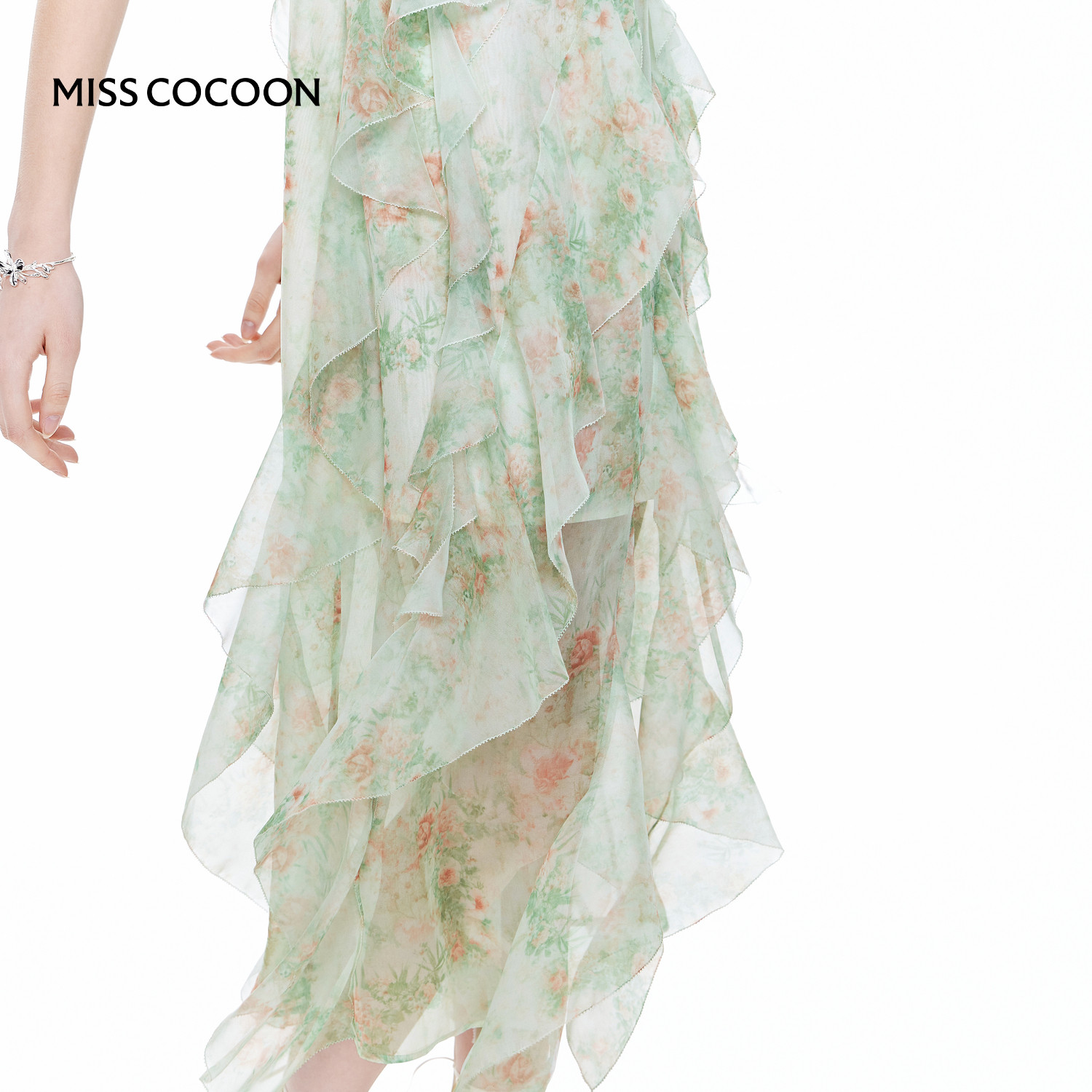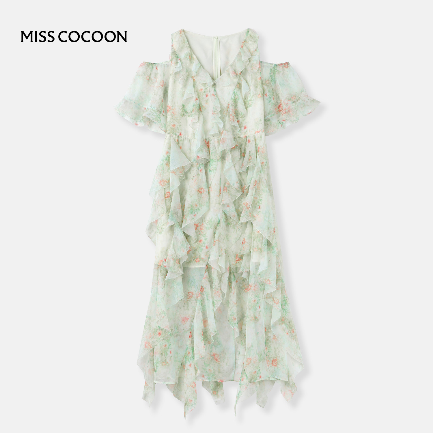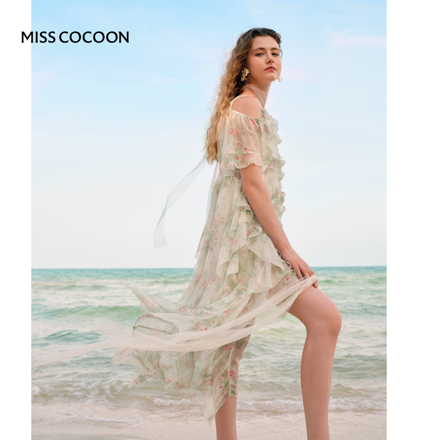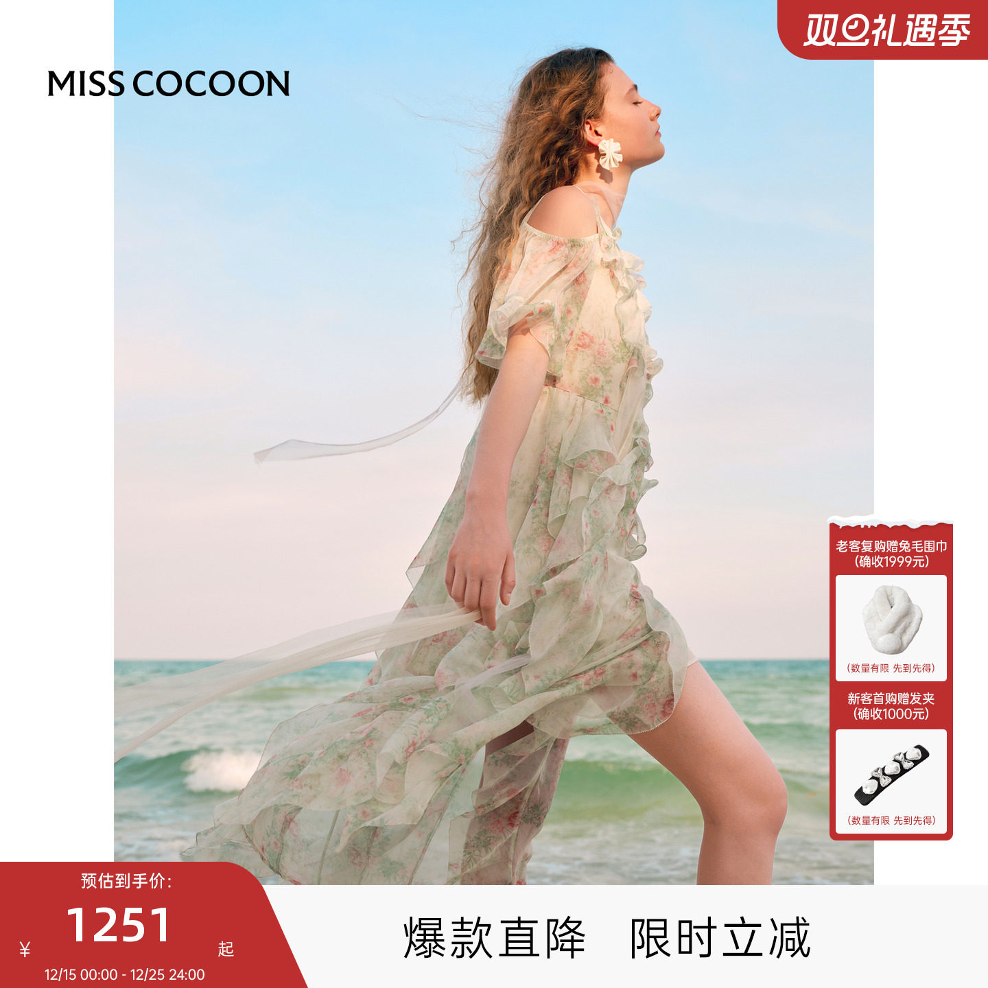MISS COCOON海边度假荷叶边连衣裙女2025秋季新款V领露肩碎花裙