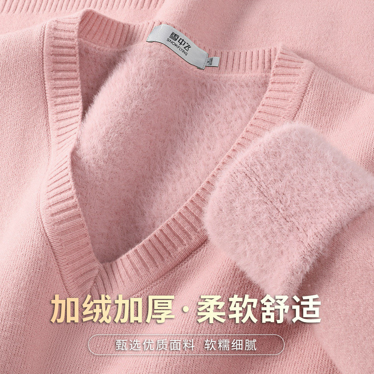 新年新款加绒加厚上衣纯色V领长袖针织衫女宽松套头毛衣