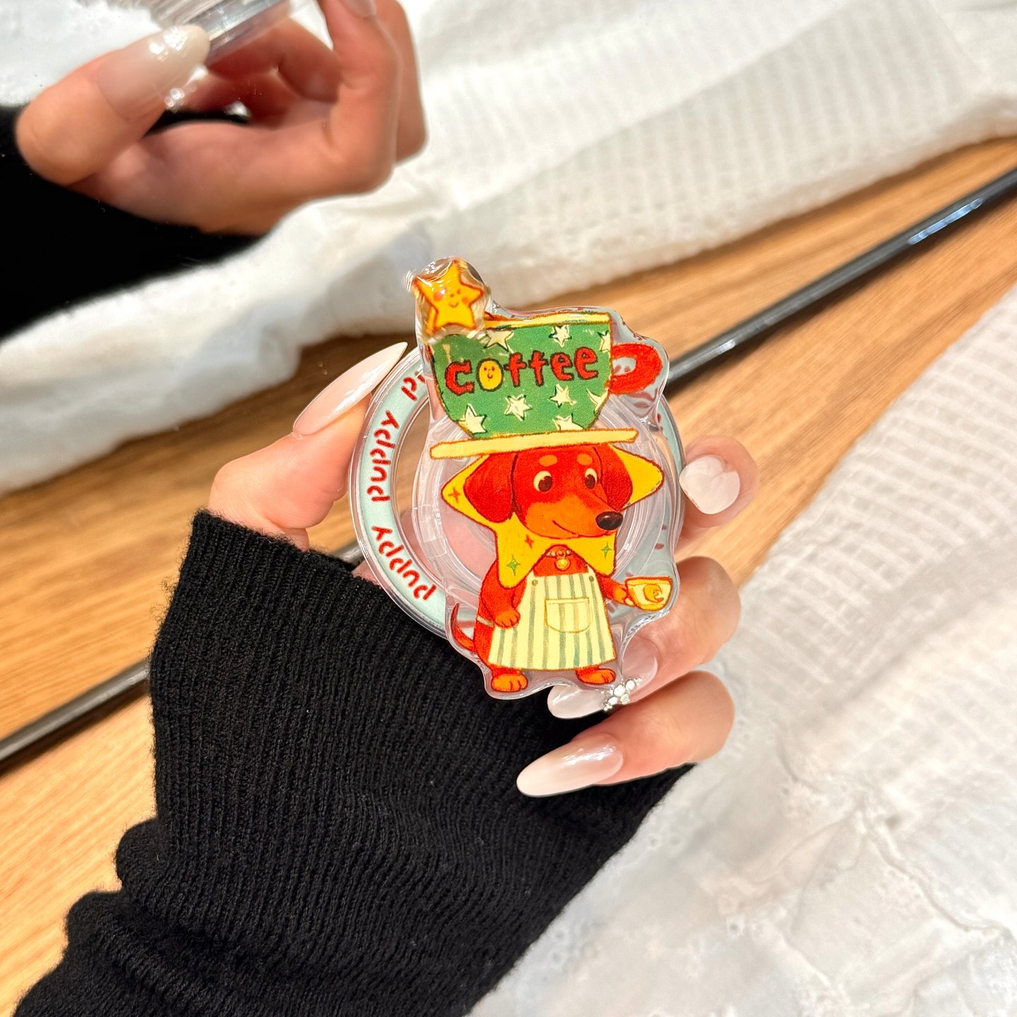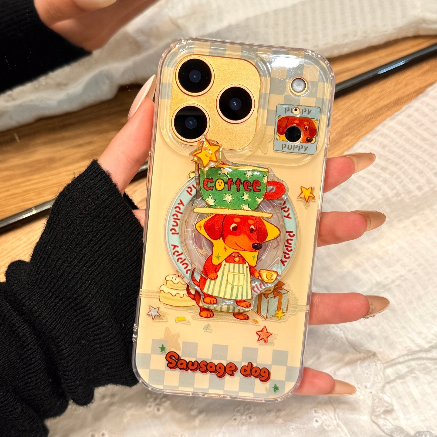 涂鸦油画可爱茶杯腊肠狗旋转磁吸支架适用于iphone17promax苹果14手机壳15新款16pro女13双层17pm硅胶防摔套
