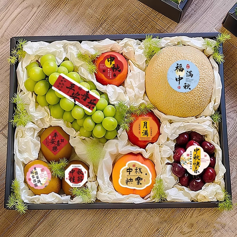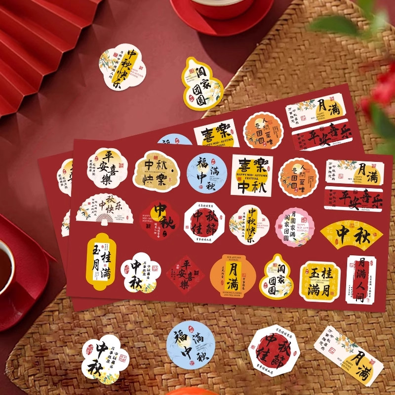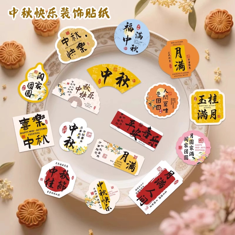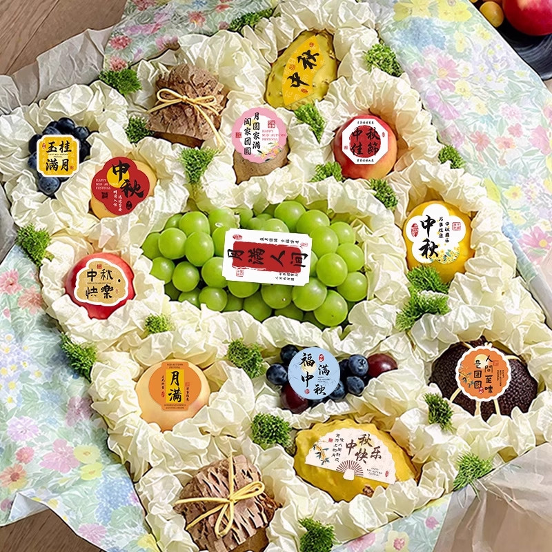120张中秋节贴纸布置高级花篮礼盒月饼果篮装饰小图案不干胶贴画
