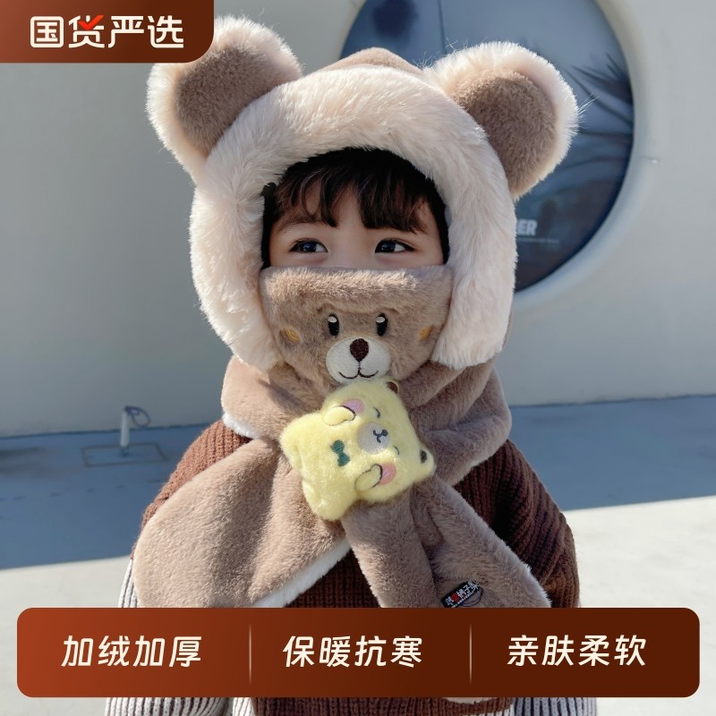 儿童帽子围巾一体冬季男童加绒保暖女童防风护耳宝宝带口罩毛绒帽