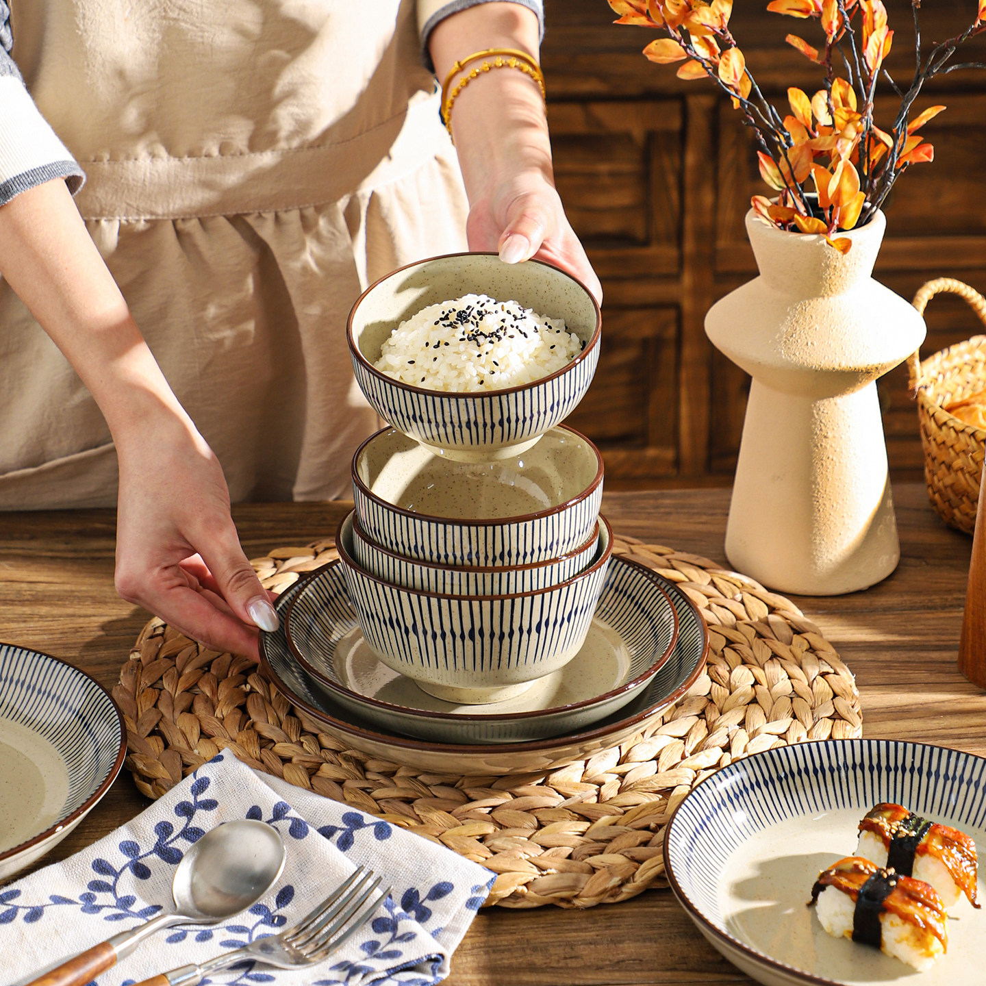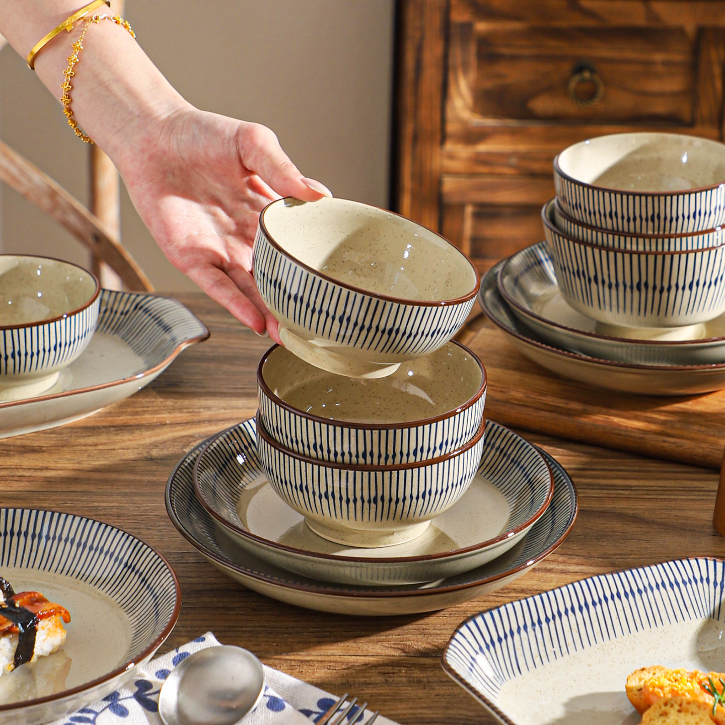 舍里中式条纹陶瓷碗盘套装家用釉下彩碗碟餐具复古米饭碗面碗鱼盘