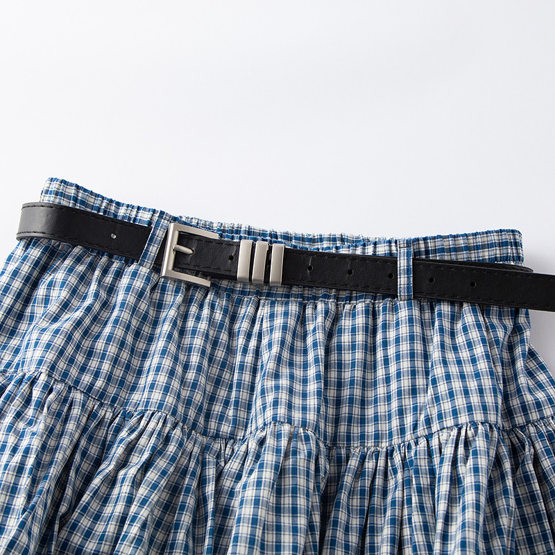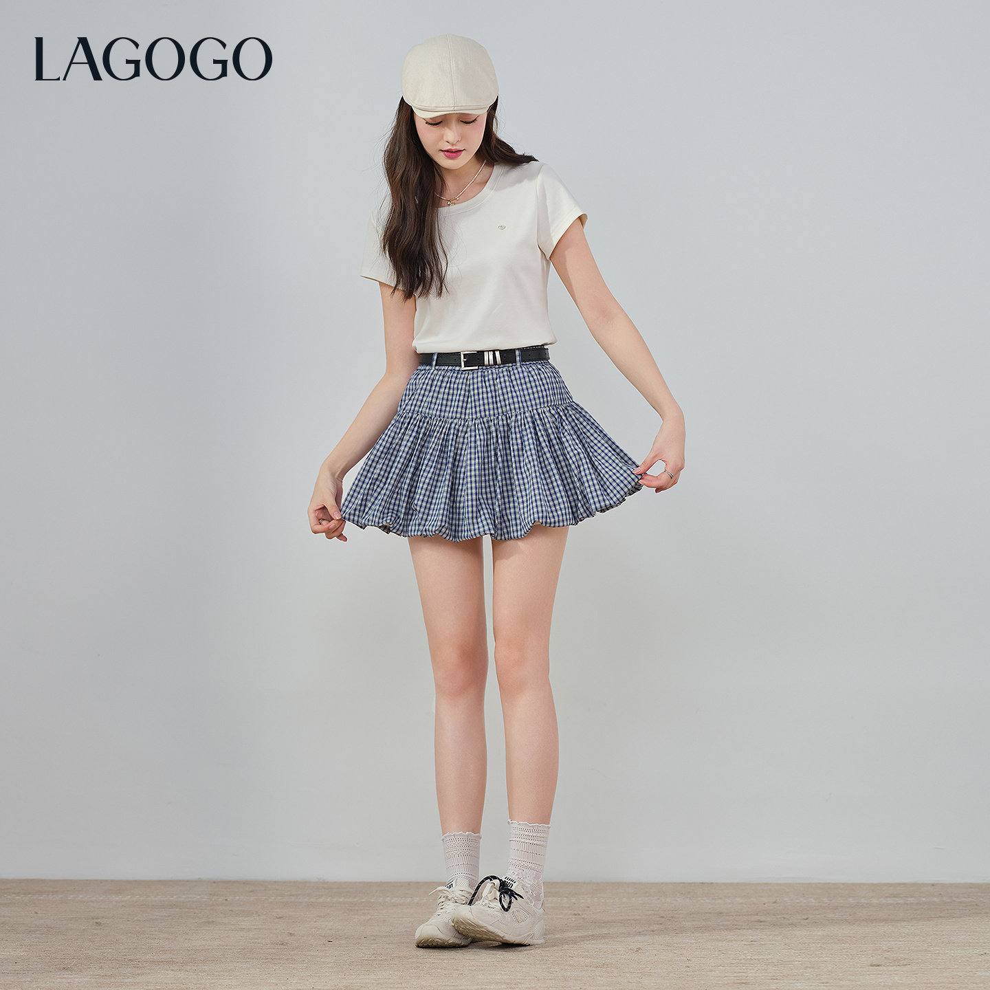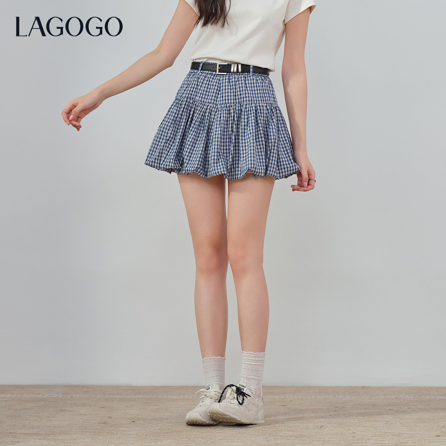 LAGOGO学院风格纹半身裙女拉谷谷2026年夏新款送腰带防走光花苞裙