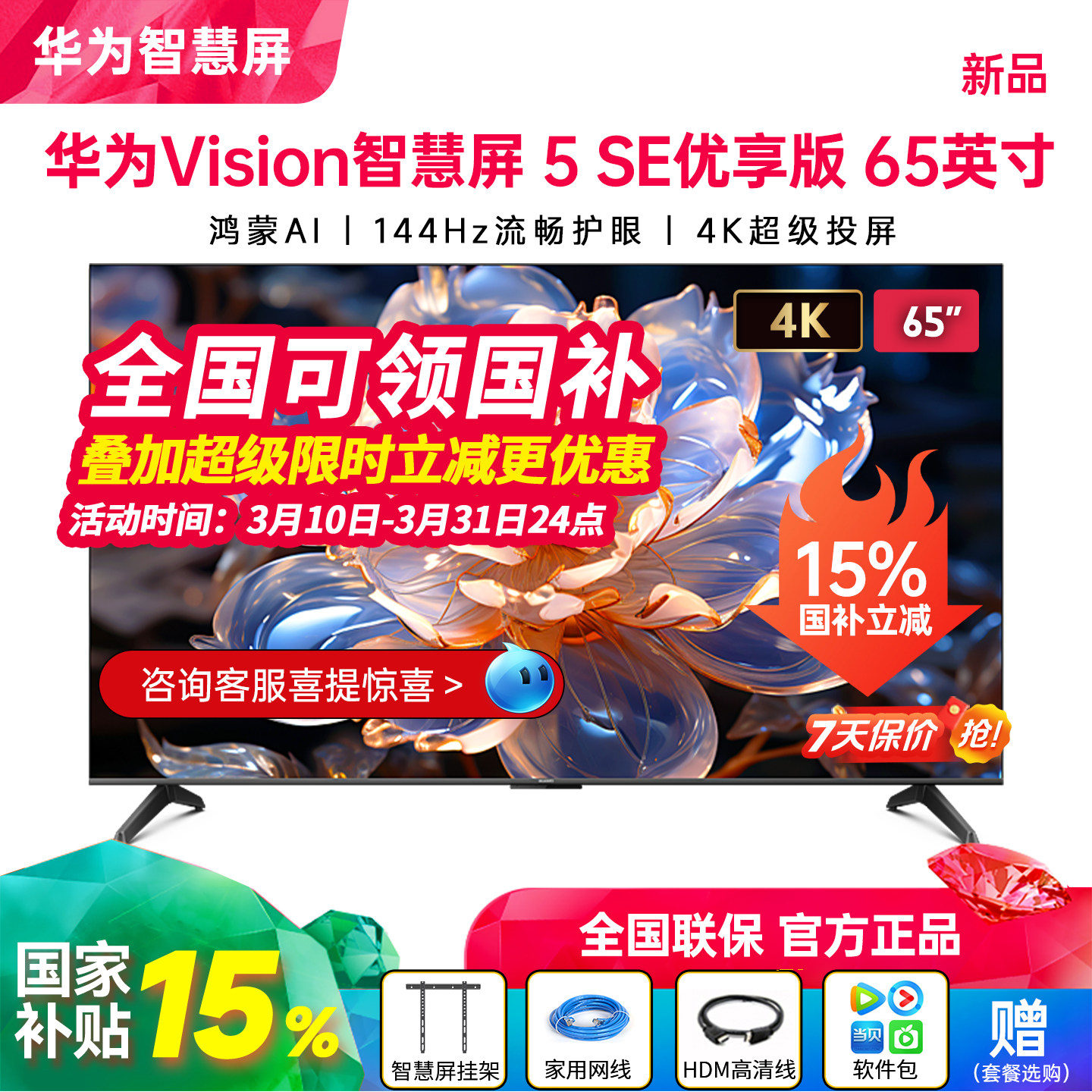 新品华为Vision智慧屏 5 SE优享版 65英寸流畅护眼4K电视机75/55