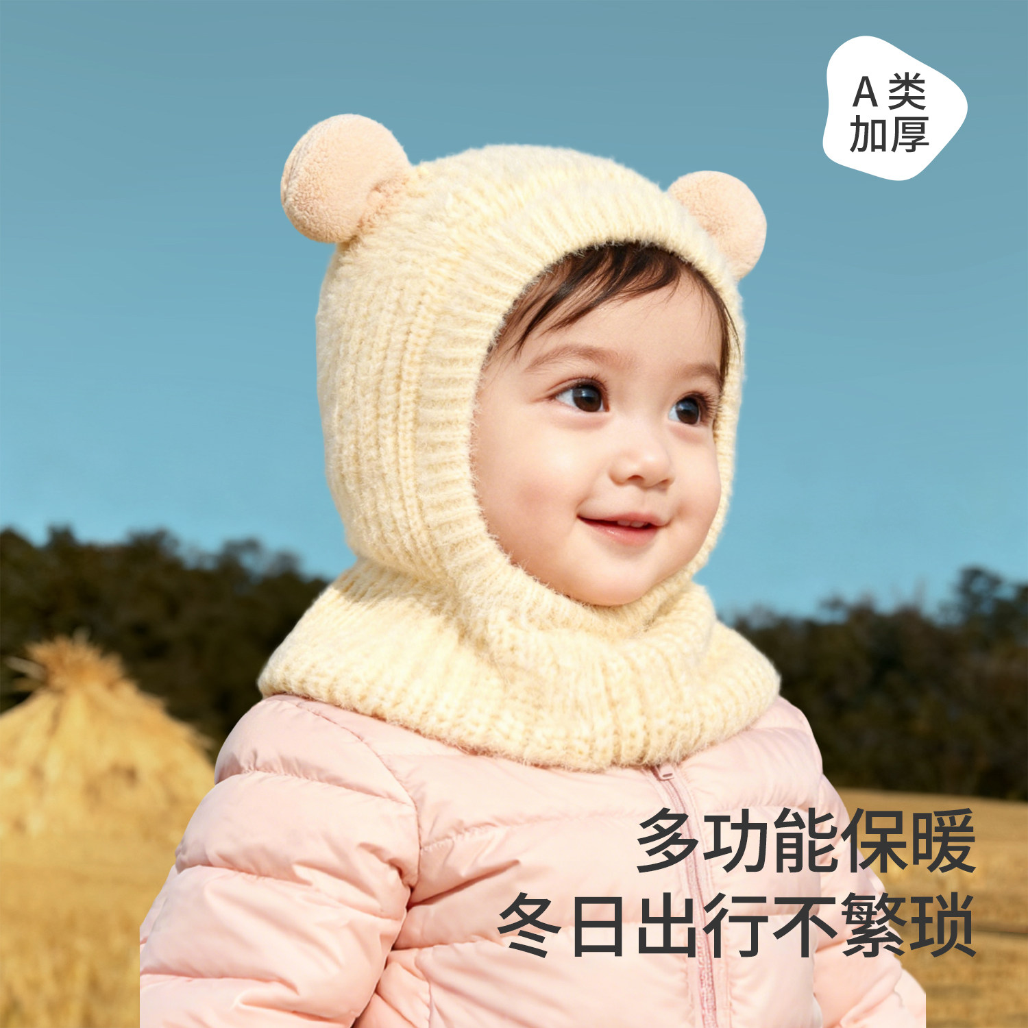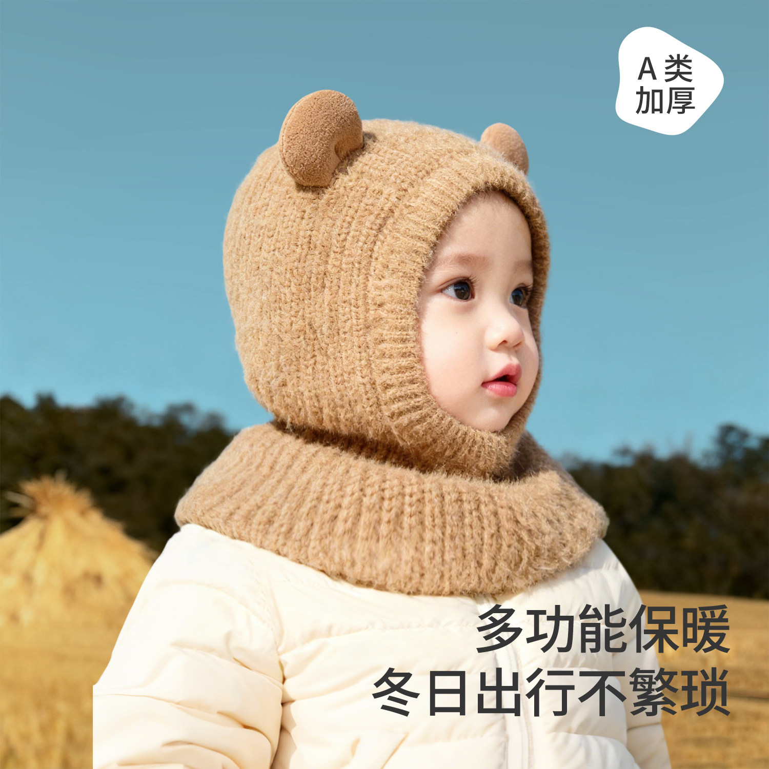 hugz儿童帽子围巾秋冬户外男孩女孩保暖针织毛线帽护耳防风熊仔帽