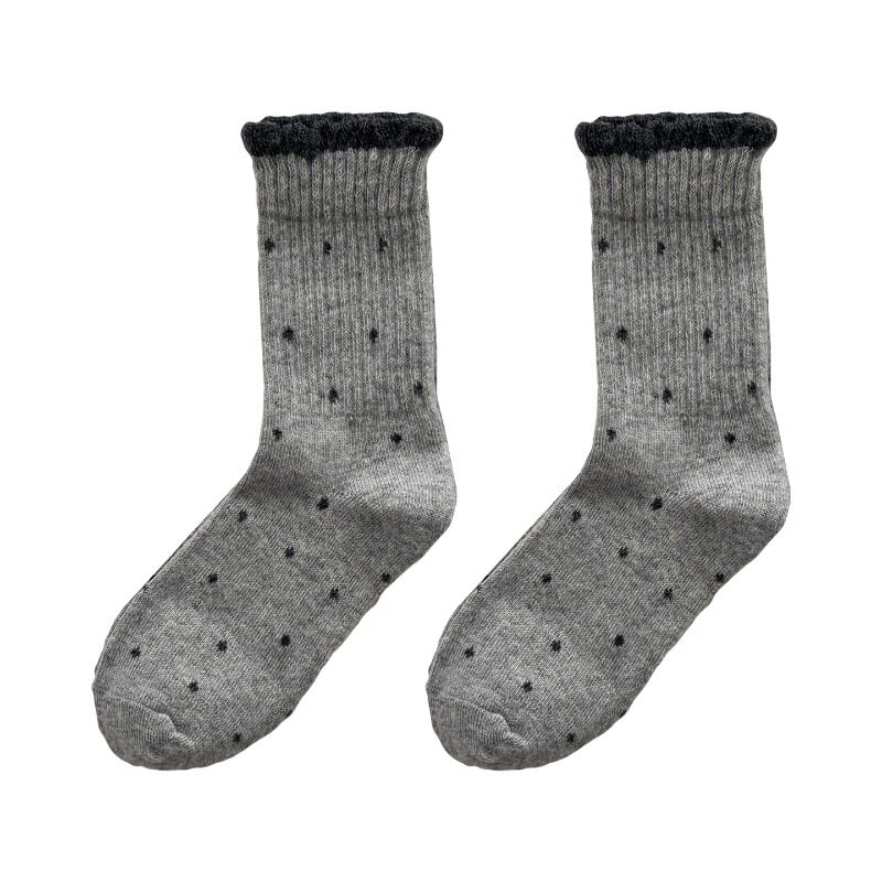 波点女士袜子女款秋冬新疆棉中筒袜加厚保暖灰色棉袜复古花边长袜
