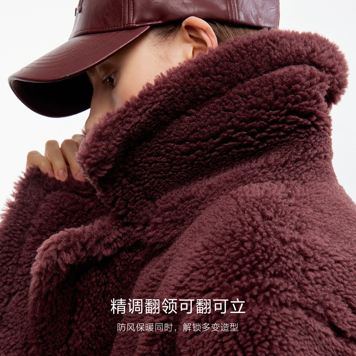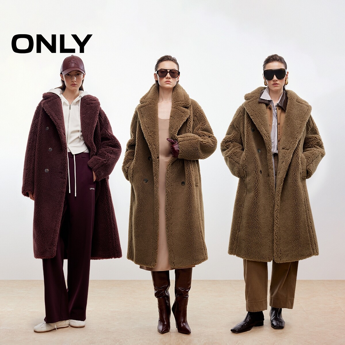 ONLY2025冬季新款双排扣宽松翻领纯色长款仿泰迪熊毛呢大衣外套女