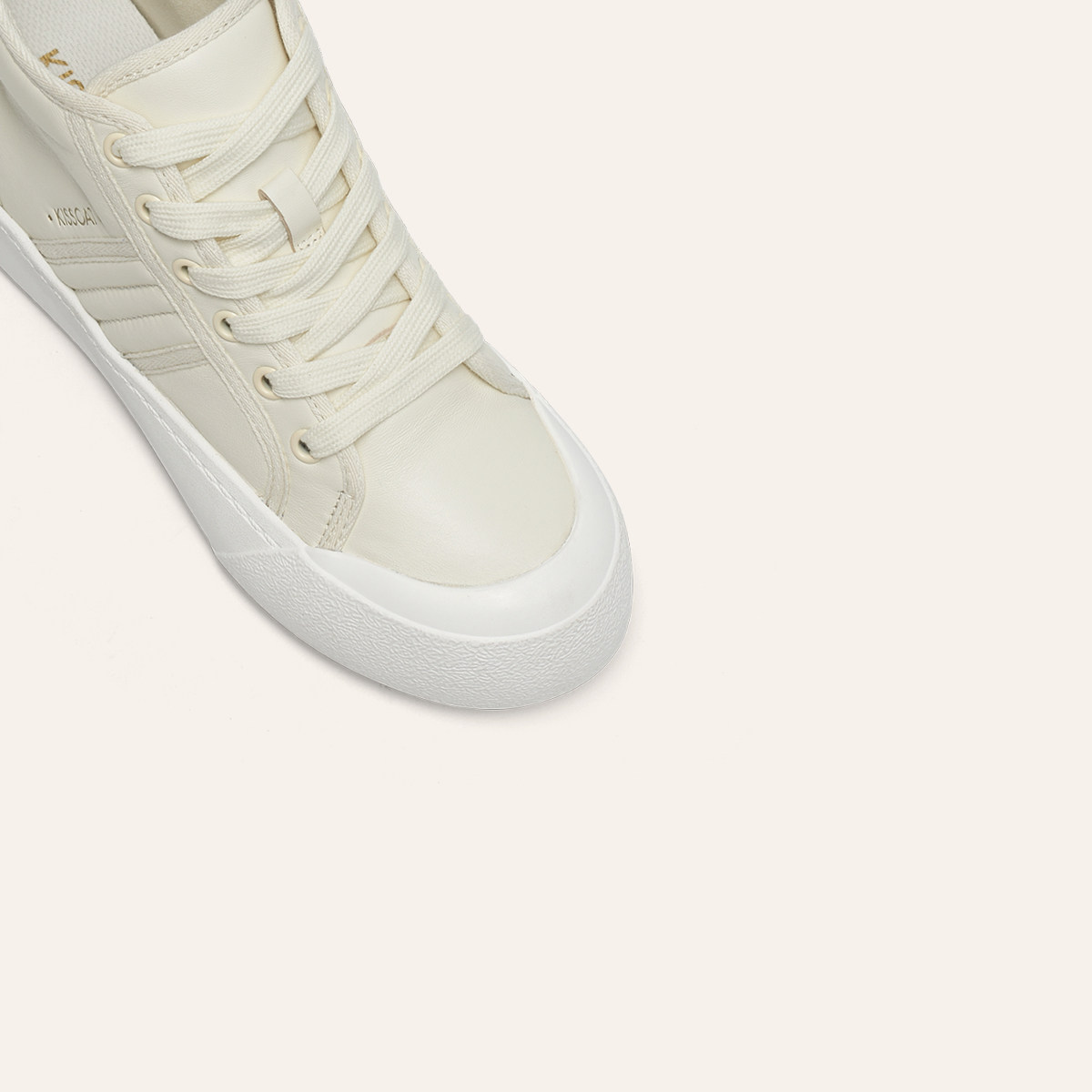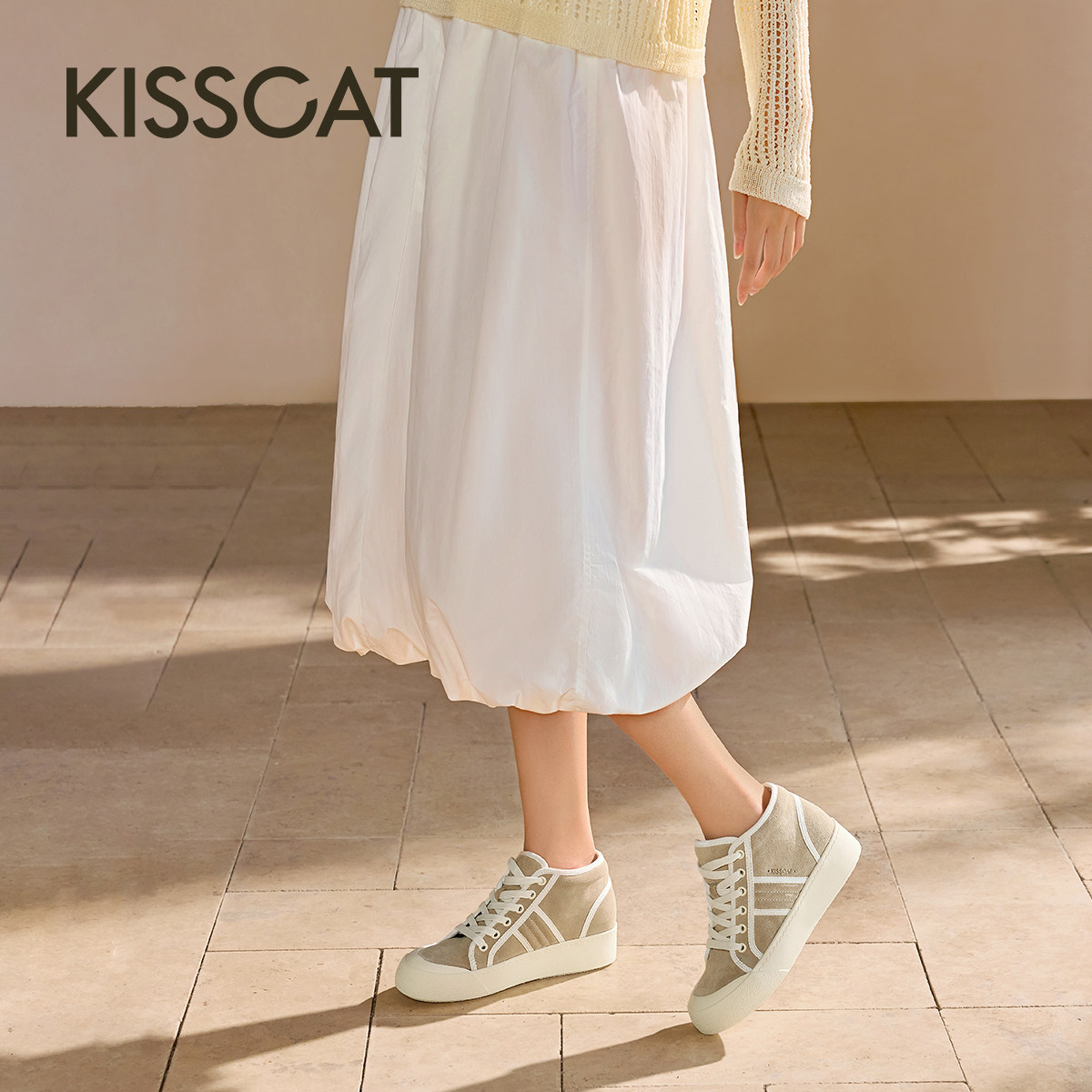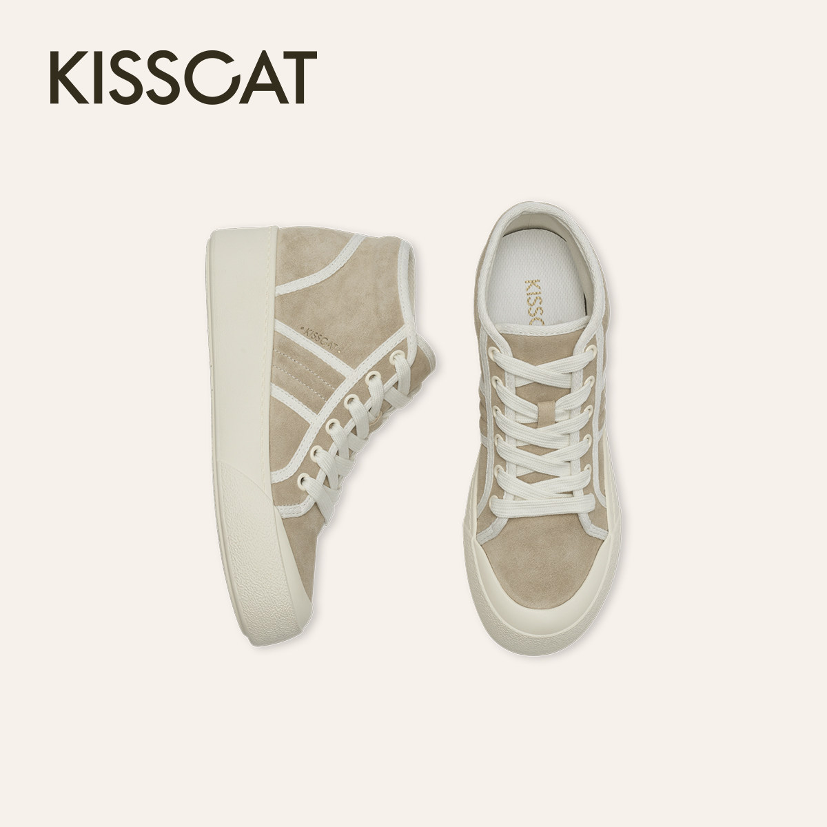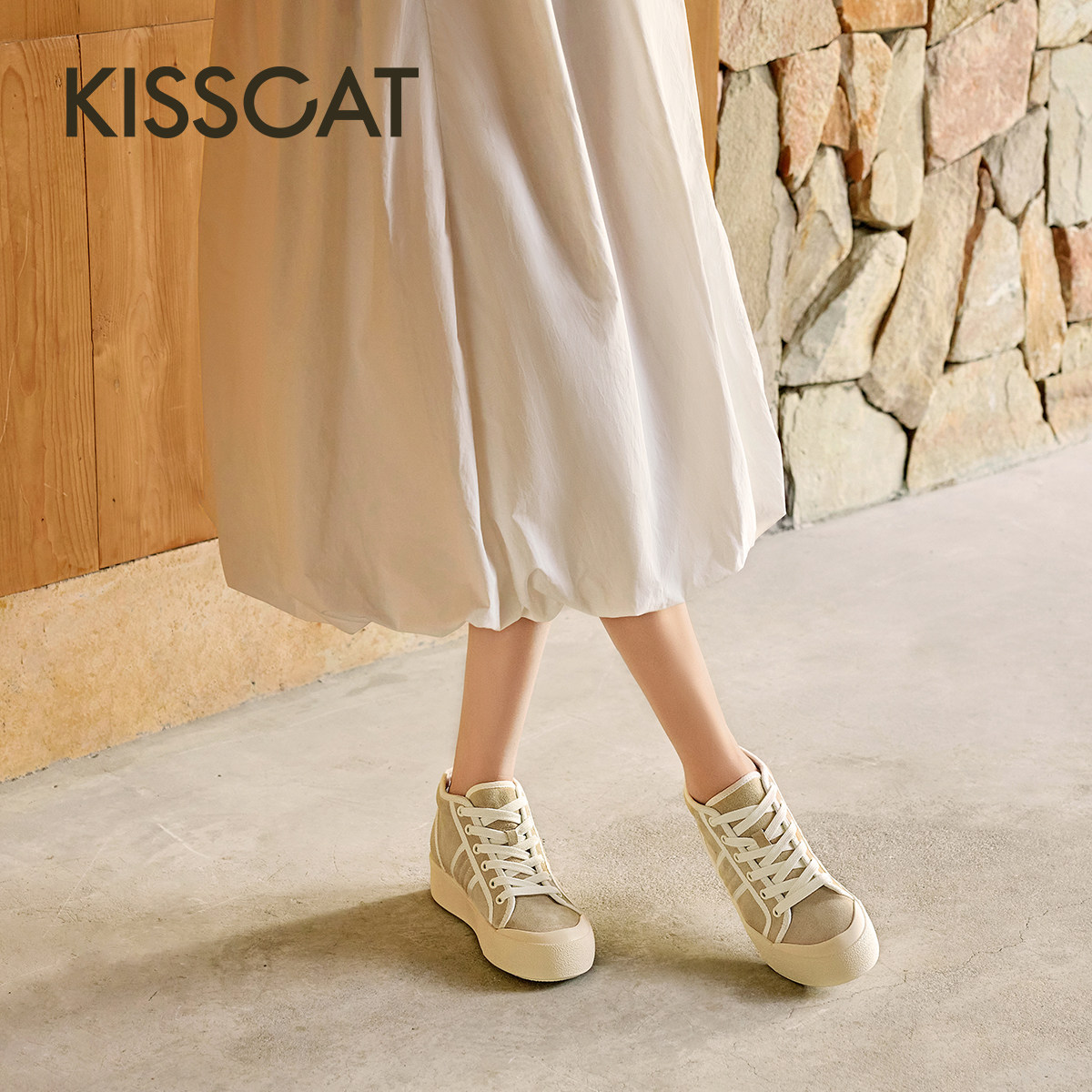 KISSCAT接吻猫春秋季平底休闲运动鞋内增高帆布鞋米白色高帮鞋女