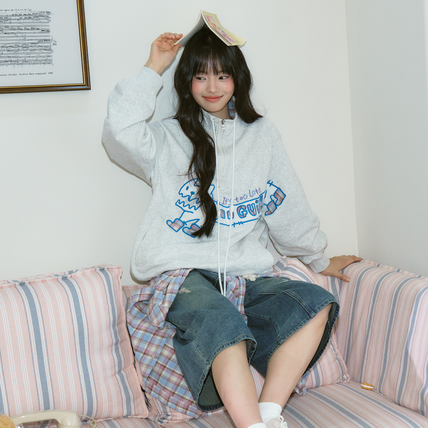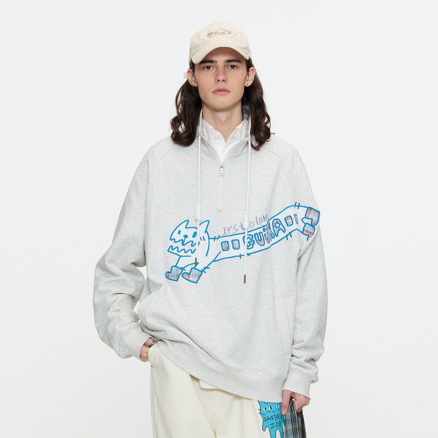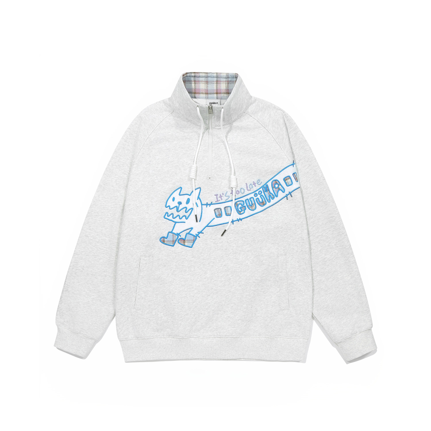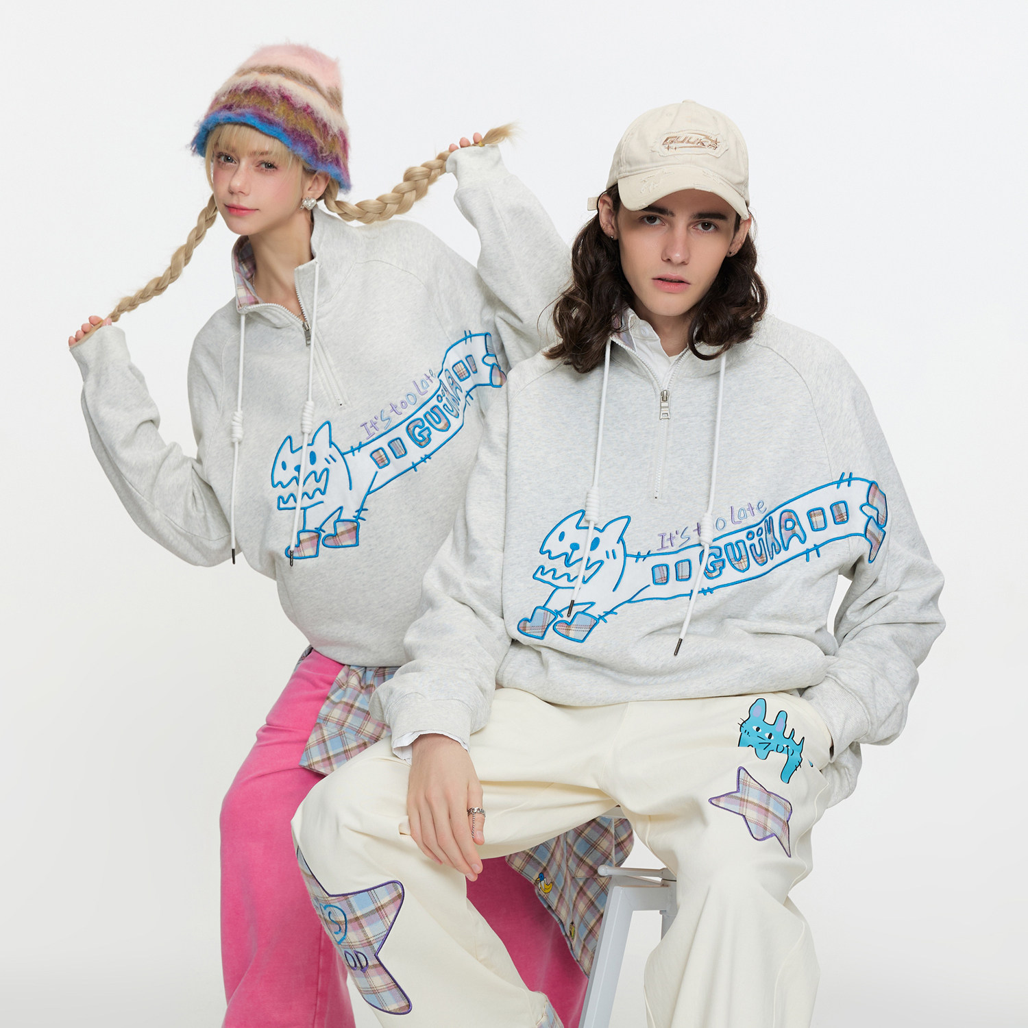 武星同款GUUKA潮牌猫咪巴士半拉链卫衣男秋 情侣插肩袖重磅套头衫
