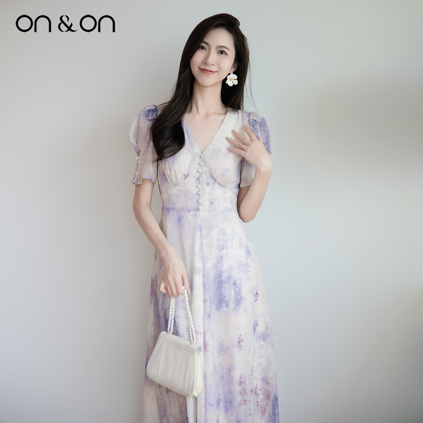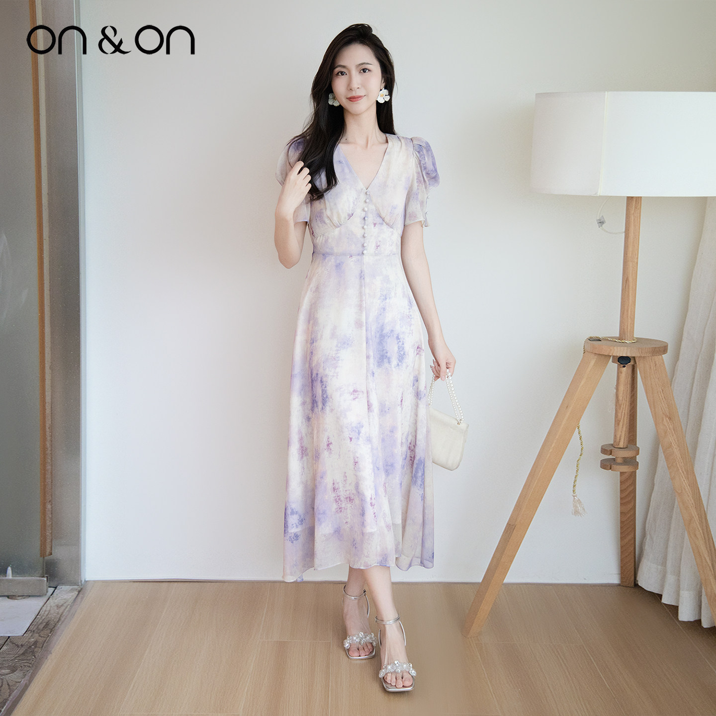ON&ON/安乃安2026春夏新款韩系复古V领水墨印花晕染系带连衣裙女