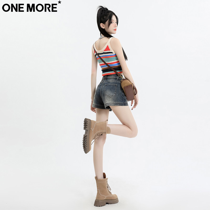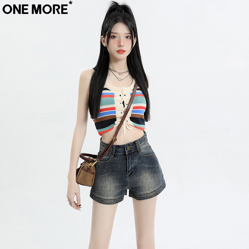 One More潮流时尚复古牛仔短裤女夏季新款高腰弹力显瘦a字热裤子