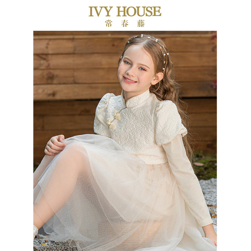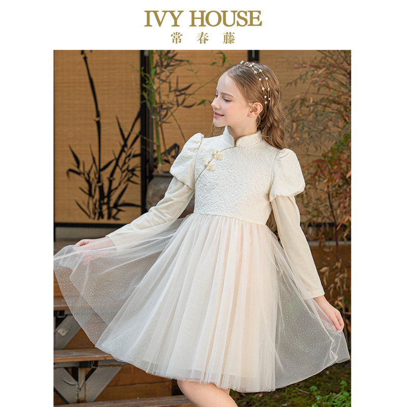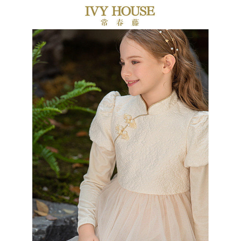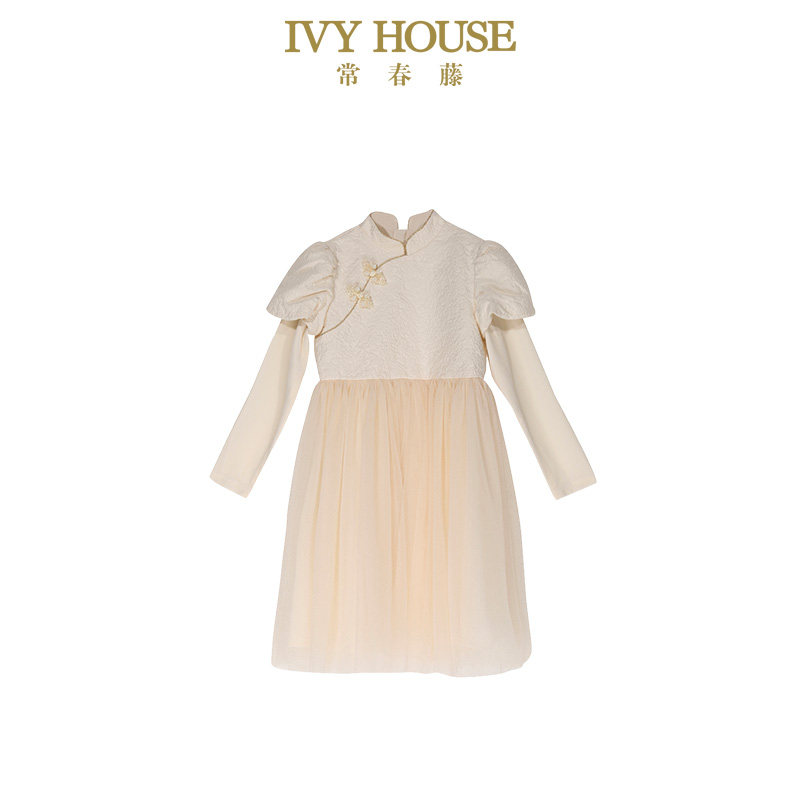 IVY HOUSE常春藤童装女童秋季款 新中式旗袍领提花蓬纱公主连衣裙