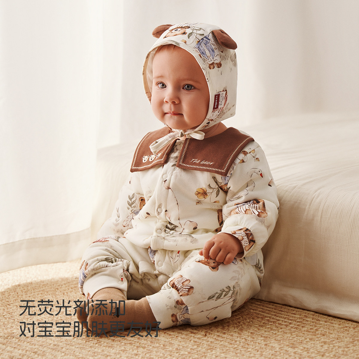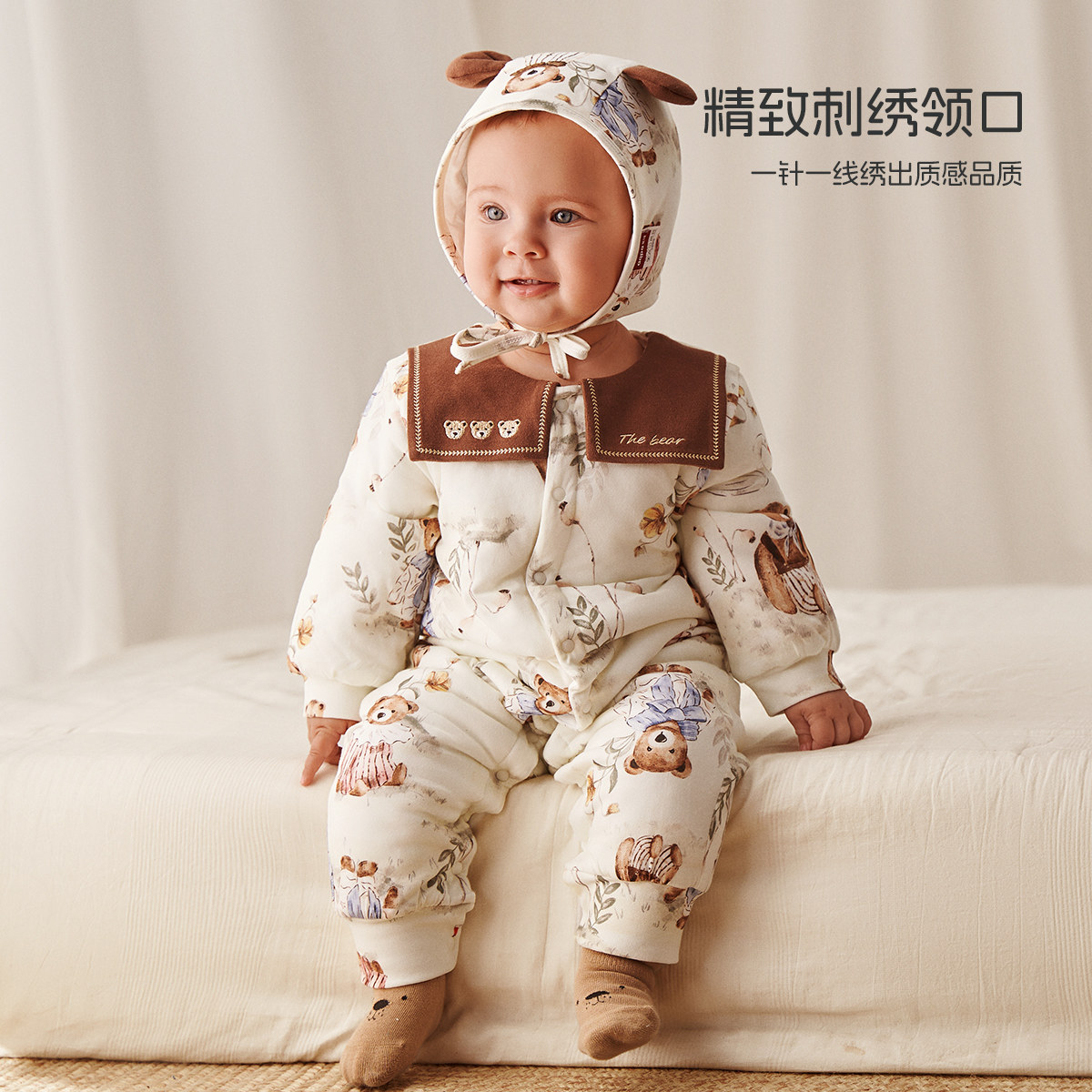 婧麒新生儿婴儿衣服秋冬夹棉满月纯棉初生宝宝秋装连体衣a类爬服