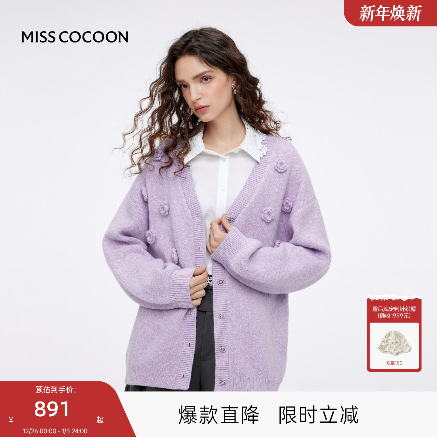 MISSCOCOON可可尼紫色毛衣外套女2025秋冬新款慵懒钩花针织开衫