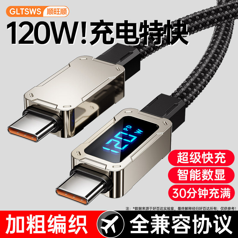 120w超级快充数据线双type-c智能数显加粗适用苹果15/14/13/12华为荣耀oppo小米vivo充电线闪充充满显示编织