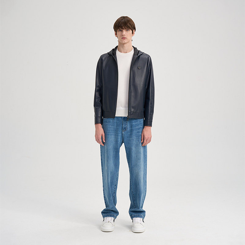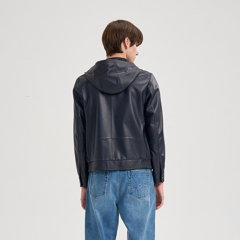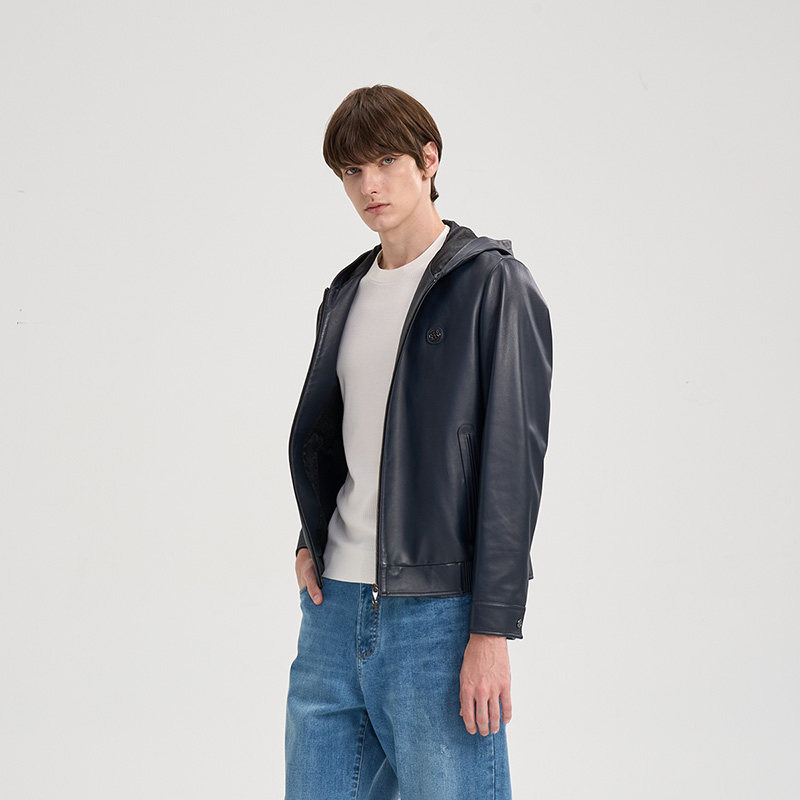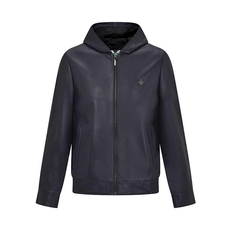 RARE威雅男装2025秋冬新款真皮皮衣男士深藏青连帽羊皮革夹克外套