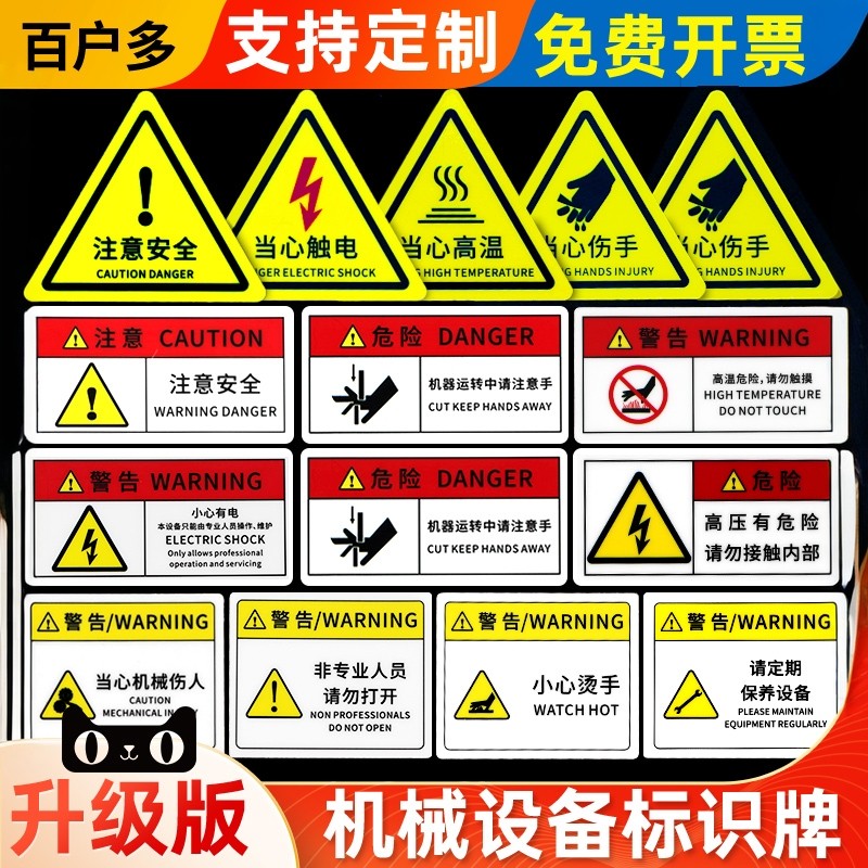 PVC胶片贴设备安全标识机器警示贴标签不干胶定制订做安全标志当心触电机械控制有电危险警示按钮箭头标示牌