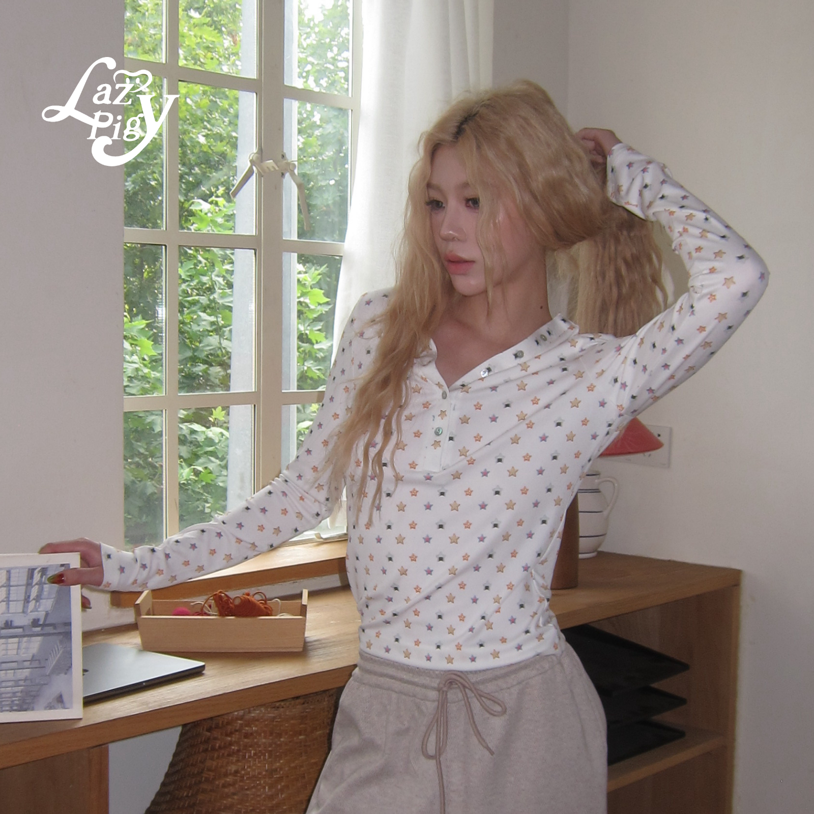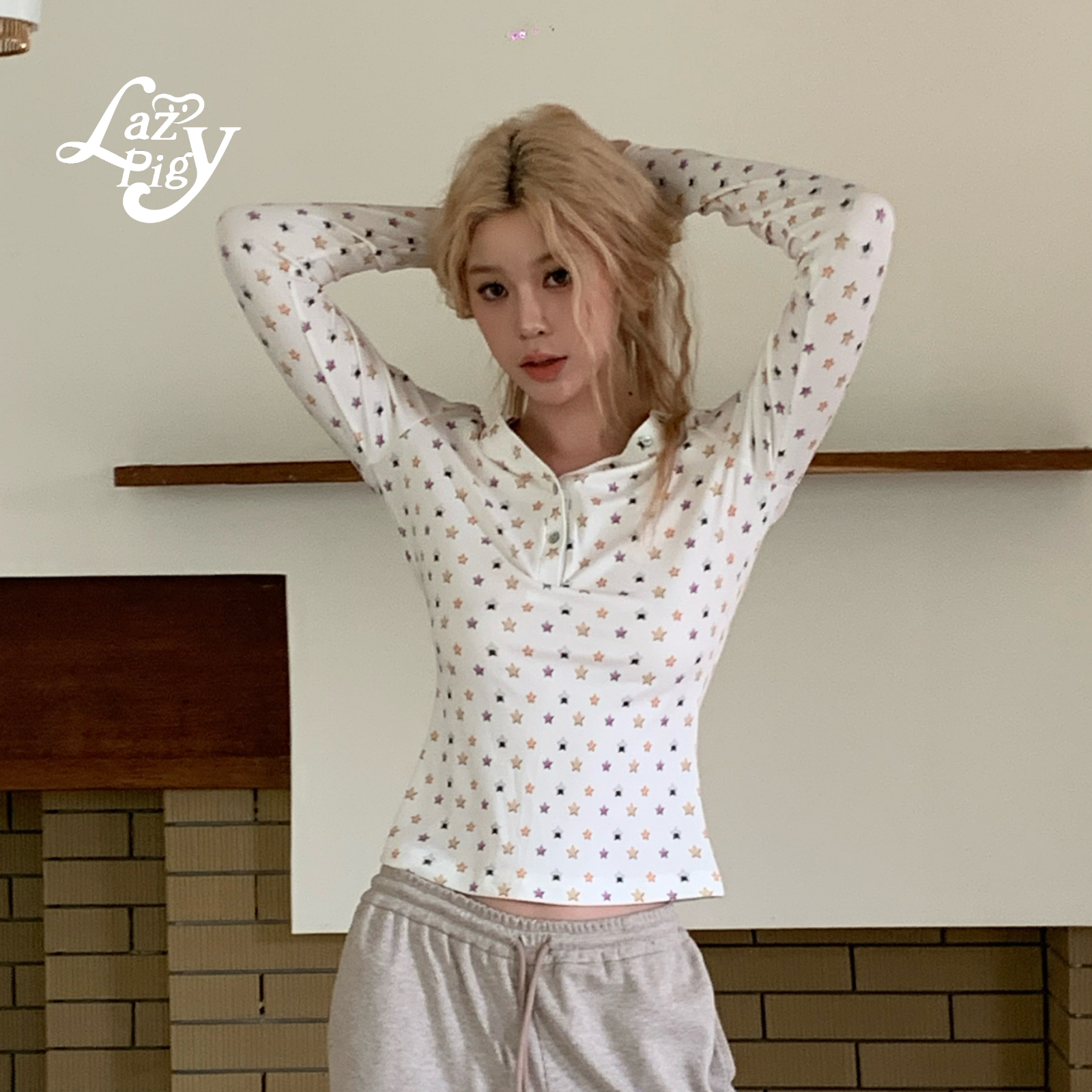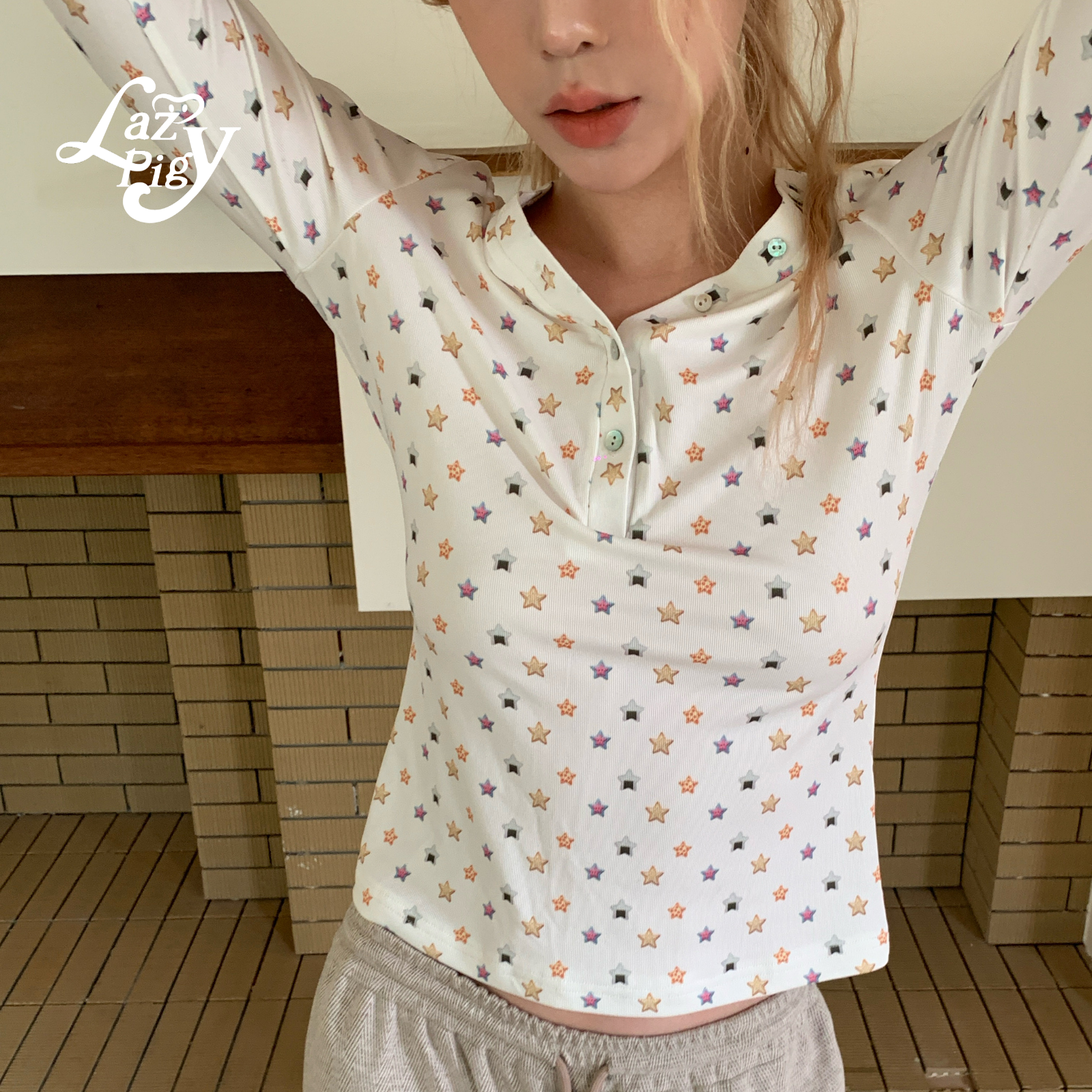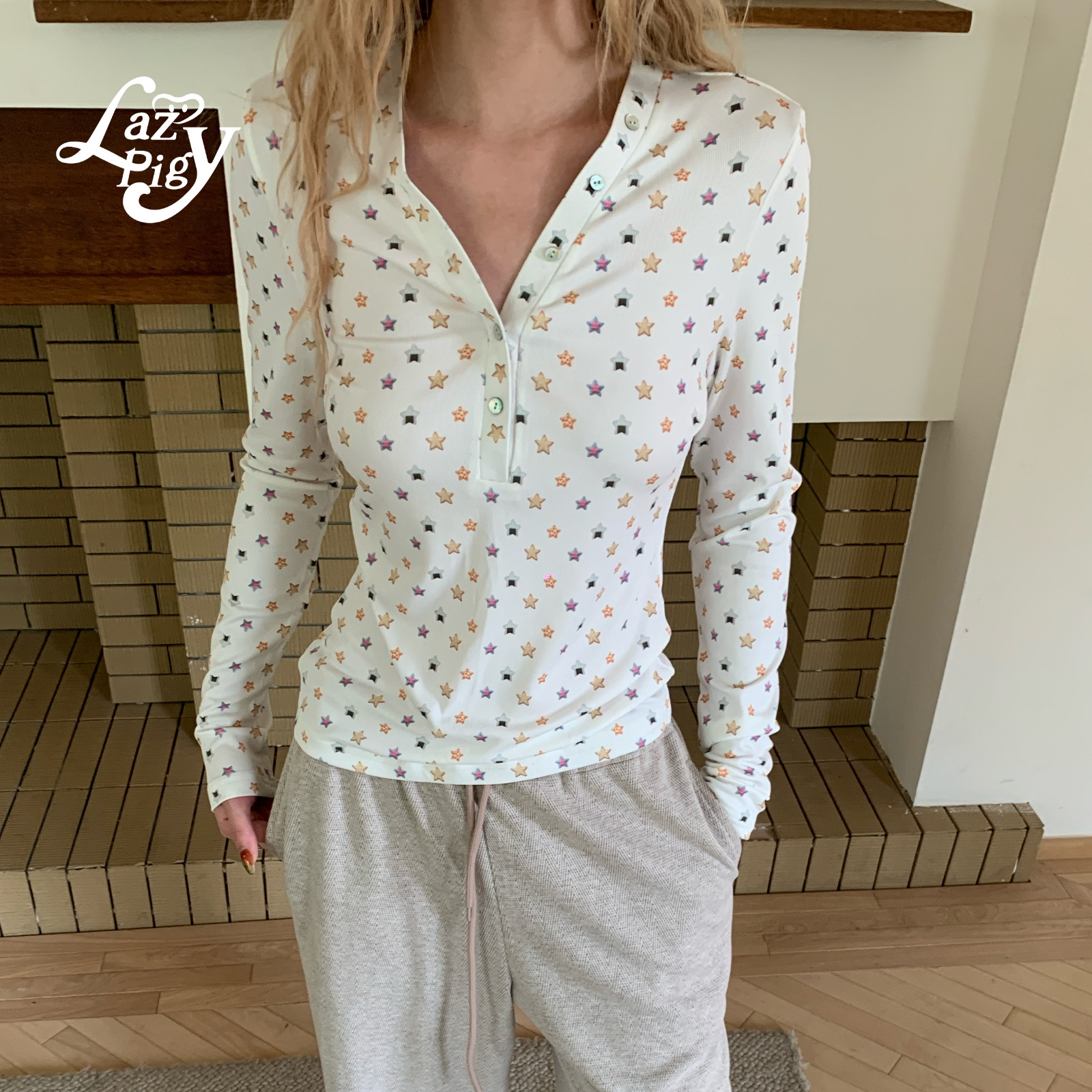 ALazyPig星星印花V领亨利T恤女25冬季新甜辣少女弹力长袖打底上衣