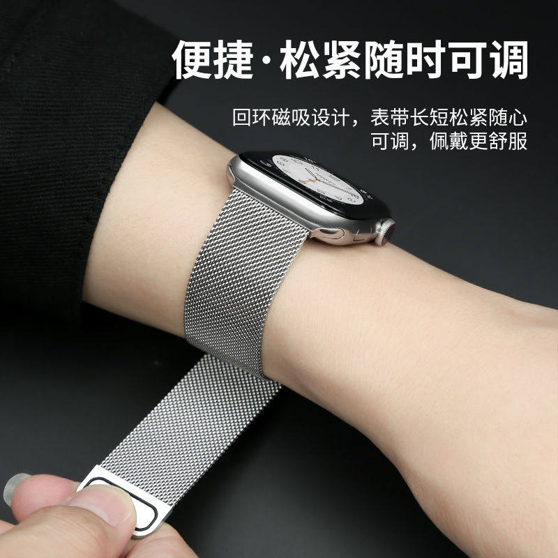 适用苹果手表表带iwatch米兰尼斯S11s10编织applewatch987/6SE金属ultra运动透气男高级非原装磁吸不锈钢银色